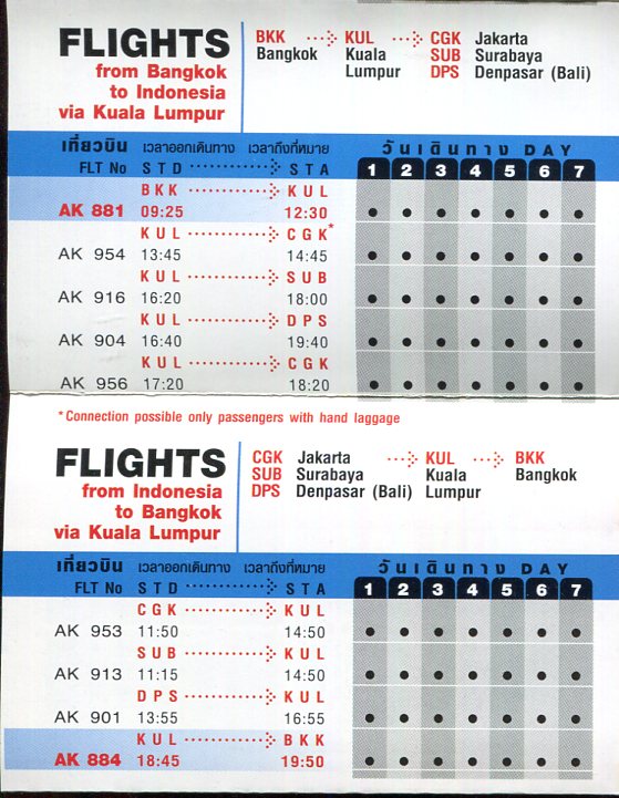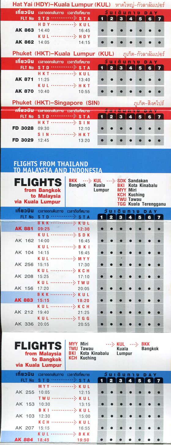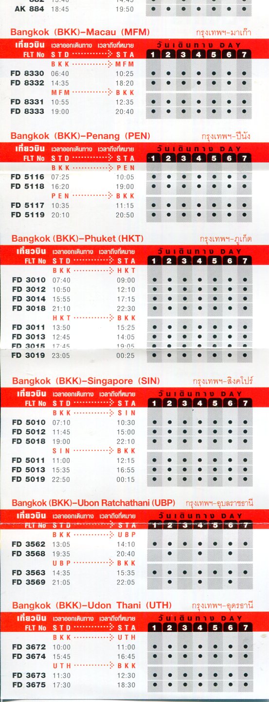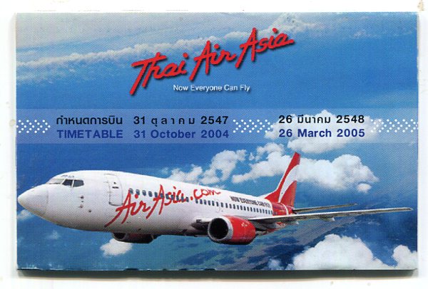 TAB24. | Thai Air Asia , A Early and Cool B-737-300 covered Thai Air Asia schedule dated October 31,2004. TT is pocket size, measuring 3 3/4" x 2 1/2" with eight double sided panels. They started operations in February 2004 with B-737-300s, used Schedule , Schedule , Schedule , Schedule | EX $5.00 |