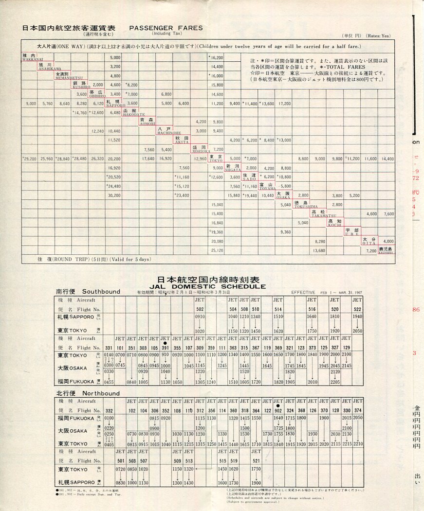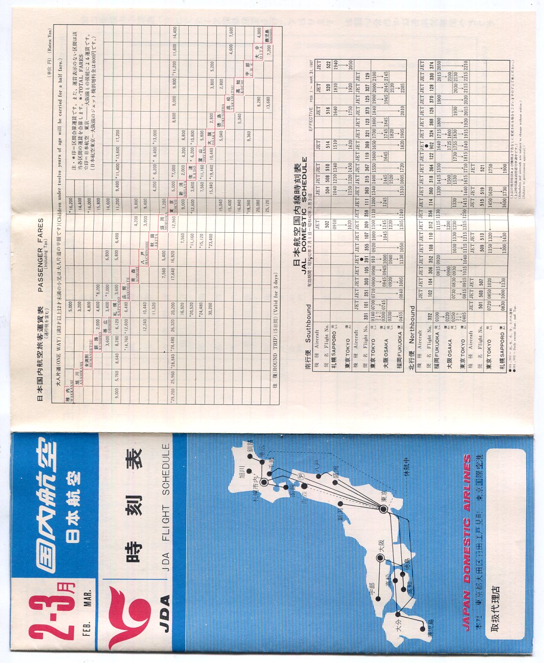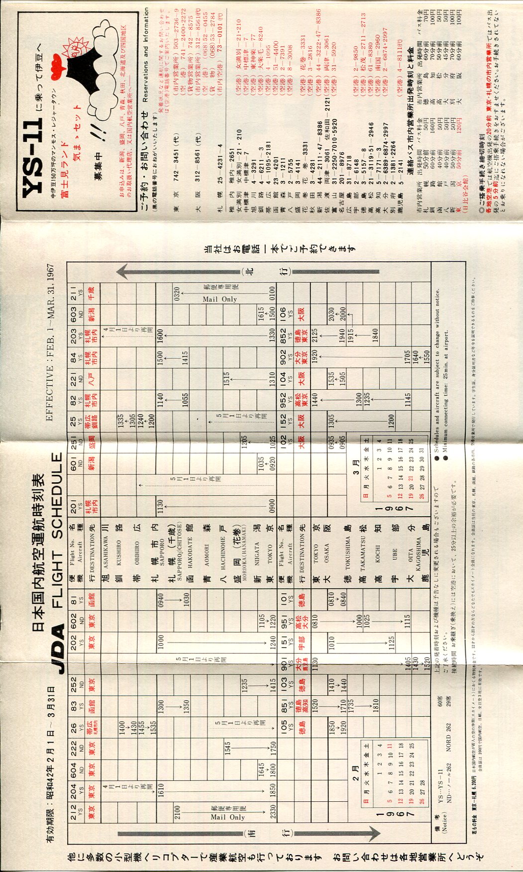 TAB25. | JDA , A JDA, Japan Domestic airline schedule dated Feb. 1-Mar. 31, 1967. TT measures 3" x 7" with four panels. Operating YS-11s, used Schedule , Schedule , | EX $10.00 |