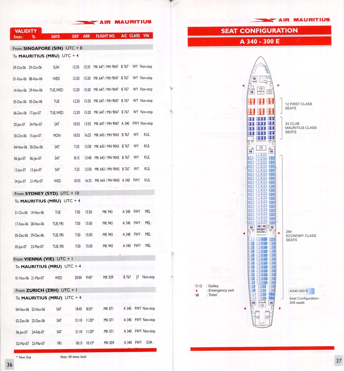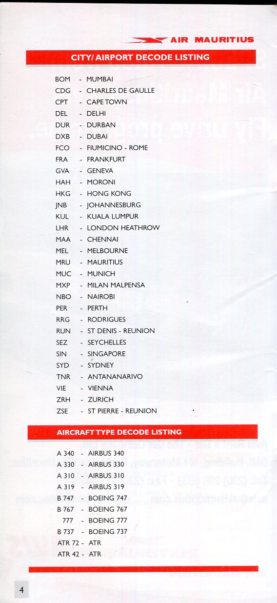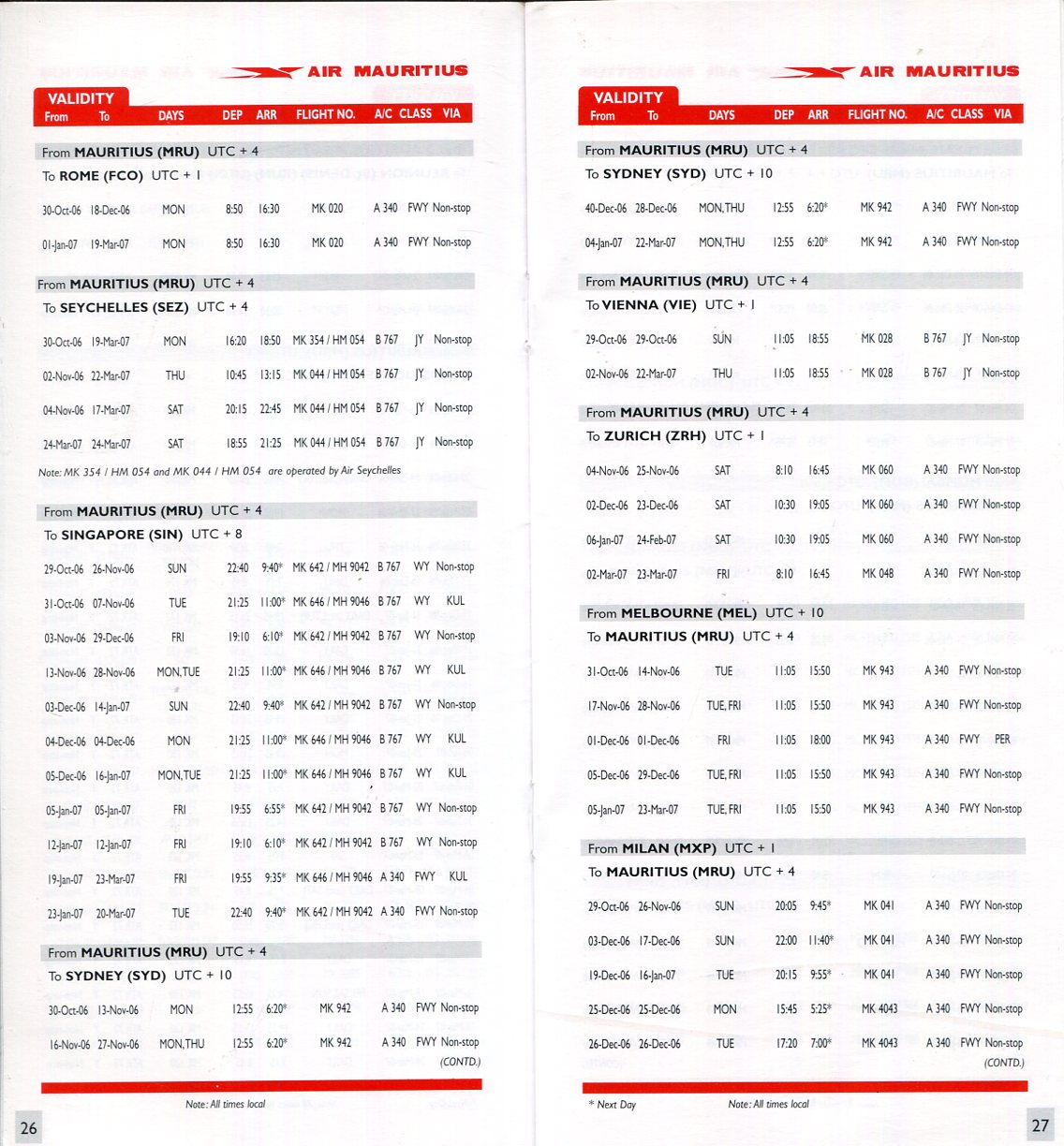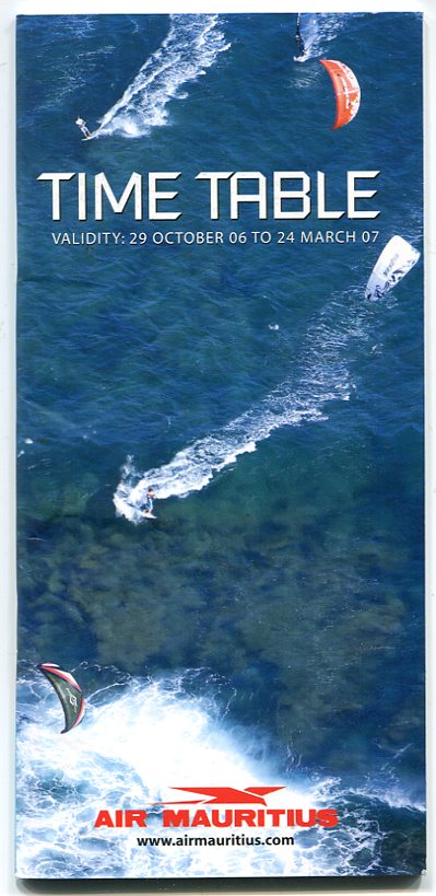 TAB26. | Air Mautritius , A Cool covered Air Mauritius system schedule dated October 29,2006. TT measures 3 7/8" x 8 1/2" with 60 pages, used Information , Route Map , Cut-A-Ways , Cut-A-Ways , Sample Schedule , Sample Schedule , Schedule & Cut-A-Way | EX $4.00 |