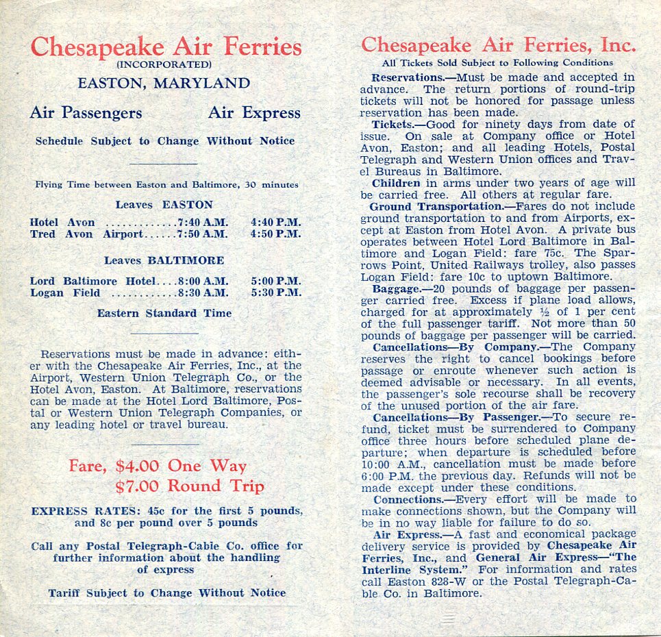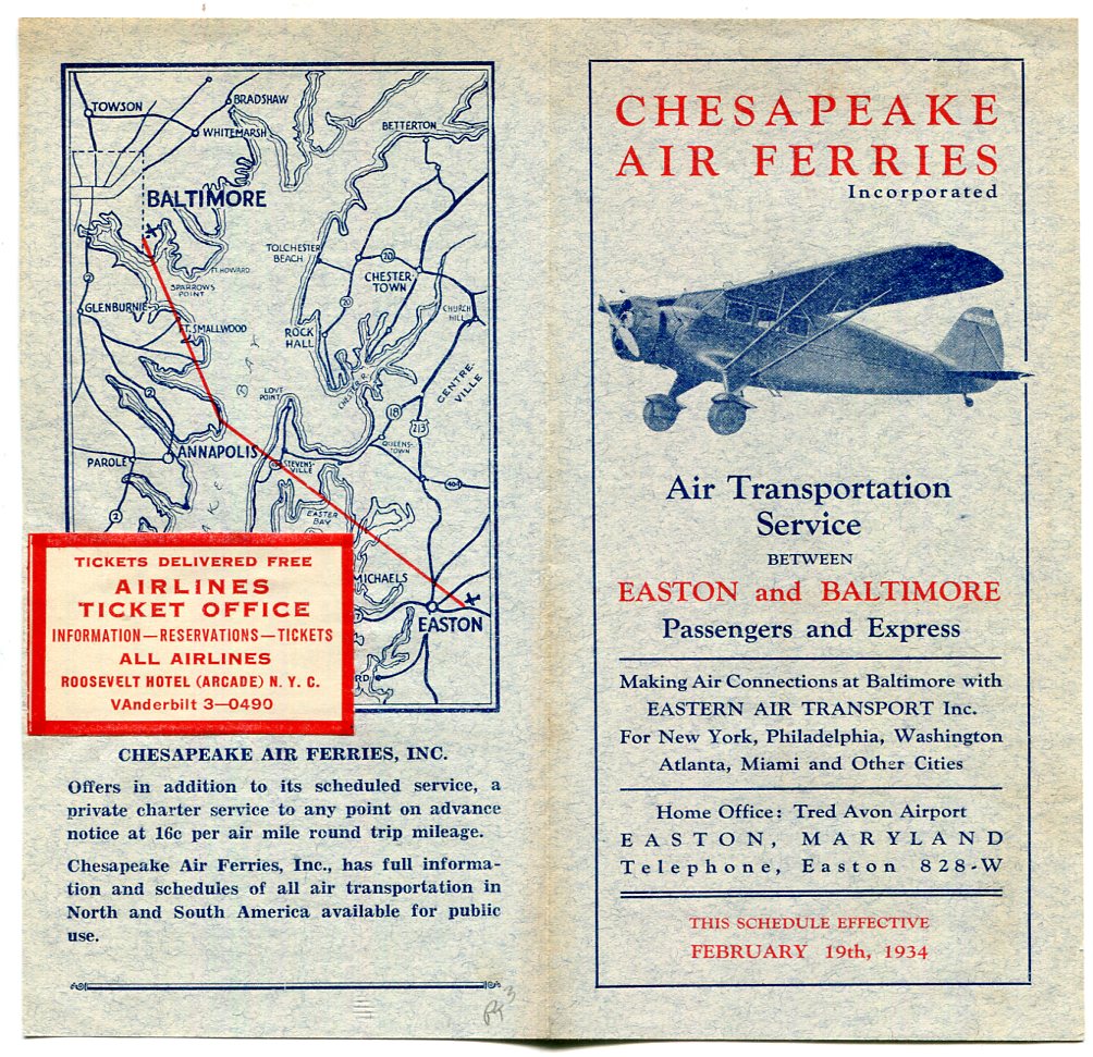 TAB27. | Chesapeake Air Ferries , A Very RARE Chesapeake Air Ferries of the U.S. schedule dated Feruary 19,1934. TT measures 3 1/4" x 6 1/4", and two paged. I have NO operational information. Ops. 1933/1934?, used Schedules | EX $85.00 |