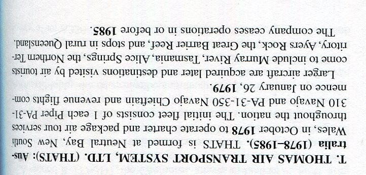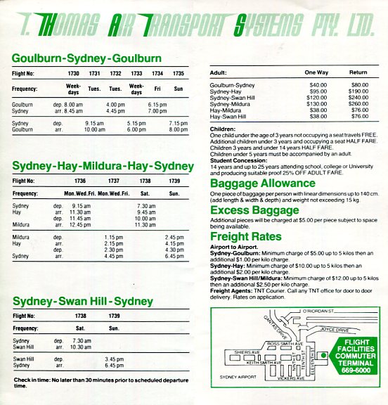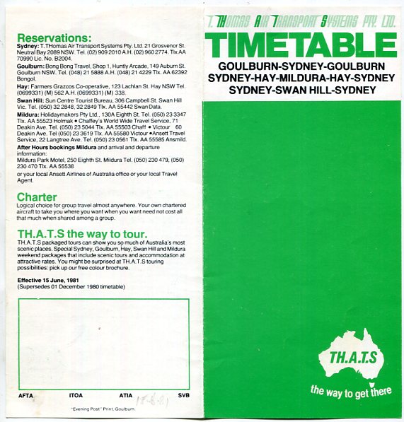 TAB28. | TH.A.T.S. , A Very Scarce T. Thomas Air Transport Systems - TH.A.T.S. Australian commuter schedule dated June 15,1981(pencil date on bottom of back cover). TT measures 4" x 8 1/8", and two paged. This is the Earlest known copy as there is a duplicate on timetableimages.com, used Schedule , TH.A.T.S. Information | EX $25.00 |