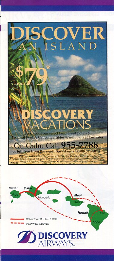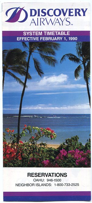| TAB29. | DISCOVERY , A Very Scarce Discovery Airways of Hawaii commuter schedule dated February 1,1990. TT measures 4" x 9" with three panels. Operations were suppose to offer intrastate service with British Aerospace BAe-146-200s in July 1989. Service was delay do to a legal battle of the citizenship of the owners. In March 1990 pending a decision, DOT grants temporary authority for flights to auai and Maui beginning on March 25,1990. DISCOVERY IS SOLD AND THE NEW OWNERS CANNOT WIN AUTHORITY. ALL ASSETS ARE LIQUIDATED IN AUGUST 1991, used Schedule | EX $15.00 |