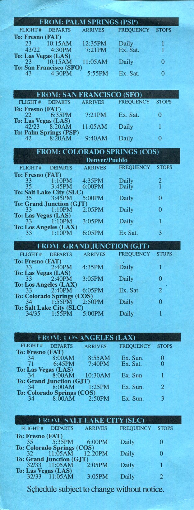 TAB2. | Air 21 , A Very Scarce, as I've only seen one other AIR 21 which happens to have the same date, which is on timetableimages.com dated March 4, 1996. TT measures 4 1/4" x 11", a two sided light card board style. Has two creases in the Top rt. and lft. corners as shown; the rest of the schedule is in Excellent condition as U can see. So, I put VG as to condition. Air 21 was founded in 1995 and began operations on December 20, 1995 using Fokker 28 aircraft linking Fresno, Las Vegas, Palm Springs, San Francisco. Air 21 ceased operations on 30Dec1996 and filed for bankruptcy protection shortly after. Air 21's scheduled services were based out of Fresno, California, used Back , Schedules on Back | VG $9.00 |