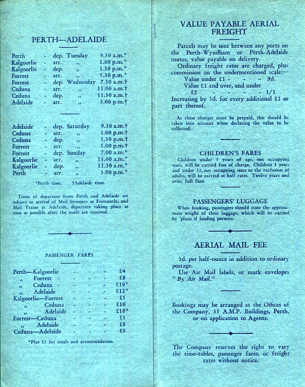 TAB30. | West Australian , A Early, and Very Scarce West Australian Airways, LTD. schedule C.early 1930s. TT measures 3 1/2" x 8 3/8" with three panels. On December 3,1926, Western Australian Airways changed its name to West Australian Airways, used Information & Schedule , Tariff & Schedule | EX $77.00 |