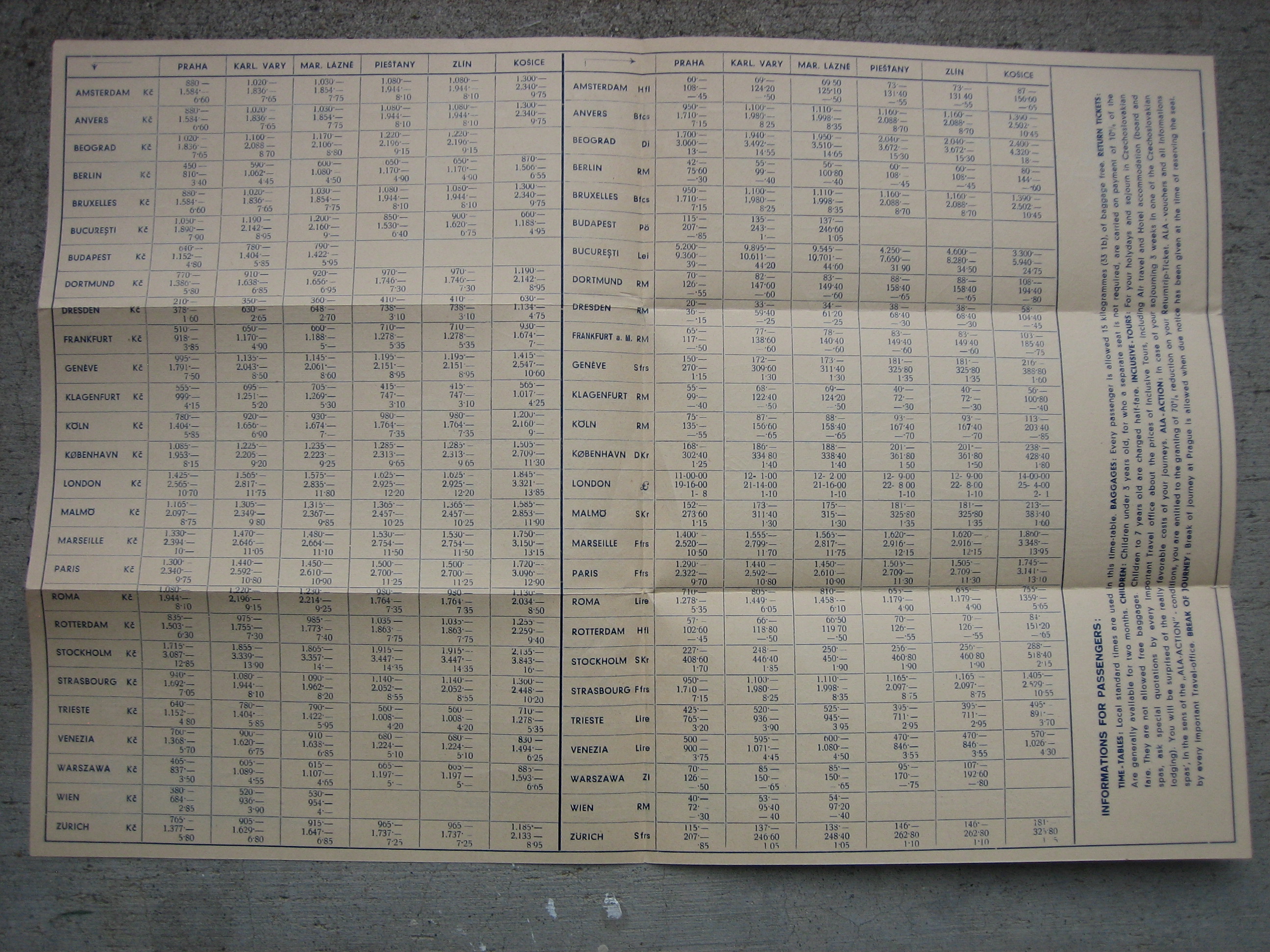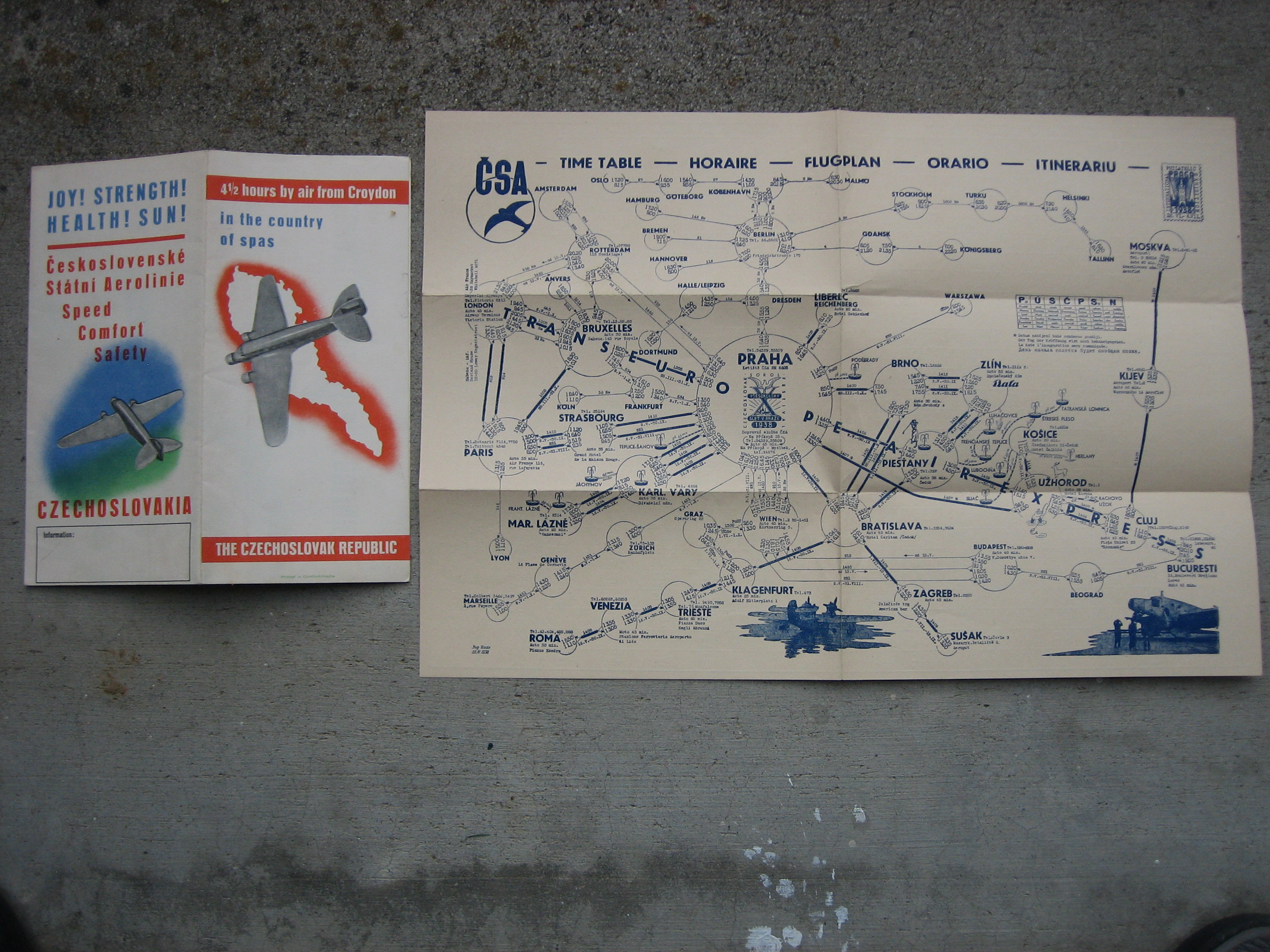 TAB31. | CSA , A Early CSA, Ceshoslovenske Statni Aerolinie brochure and system schedule dated 20-1V-1938; written in English. The schedule measures 8" x 3 3/4", and OPENS TO 16" X 11 1/8" which is inside the CSA JU-52 covered brochure. The Tarif is on the back of the scheudule, used Immediate Inside Panels , Inside of Brochure , Tariff , Domestic/Internationlal Route Map | EX+ $55.00 |