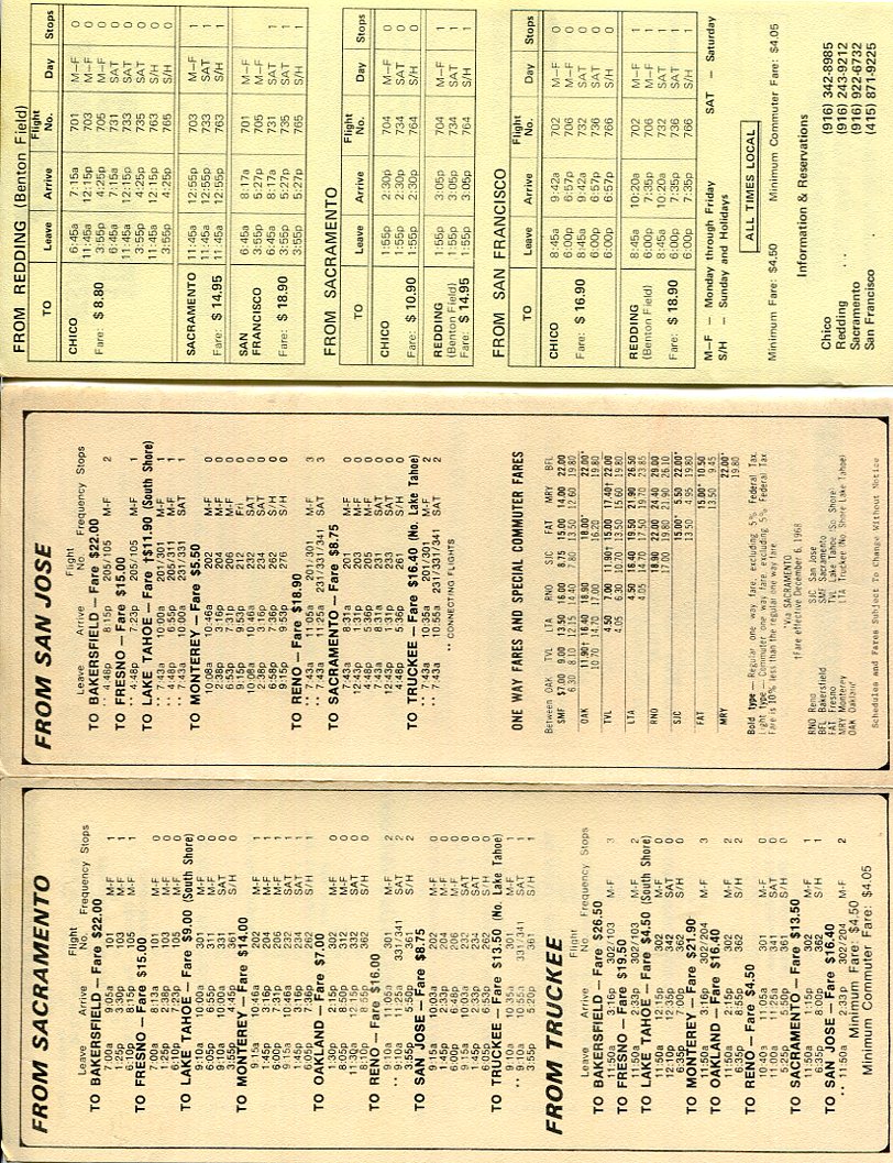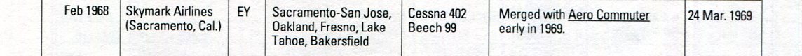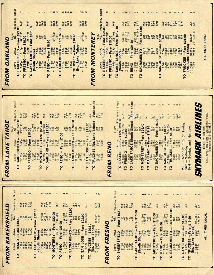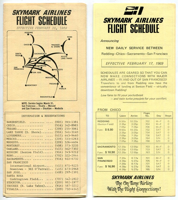 TAB32. | Skymark , A Scarce Skymark airlines California commuter schedule dated February 10,1969, with an additional "REDDING-CHICO-SACRAMENTO-SAN FRANCISCO" two sided schedule dated February 17,1969. TT measures 3 3/4" x 8 1/2" with three panels. The addtional schedule is two sided and measures 3 5/8" x 8 1/2". Started ops. in 1968, ceased ops. 1969, used Schedule , Schedule , Skymark Information | EX $17.00 |