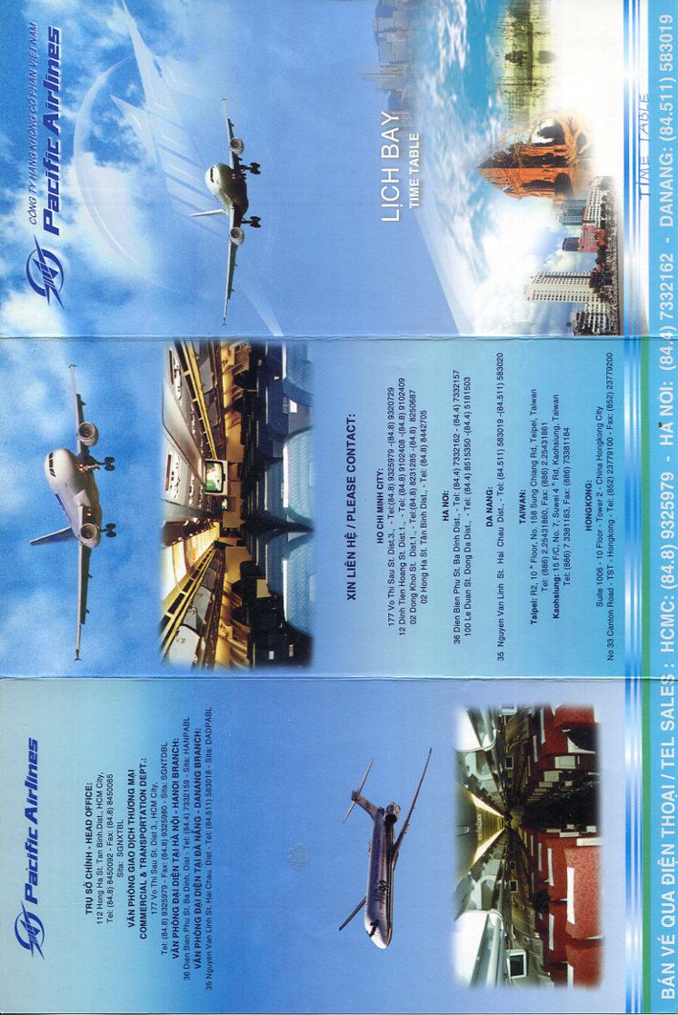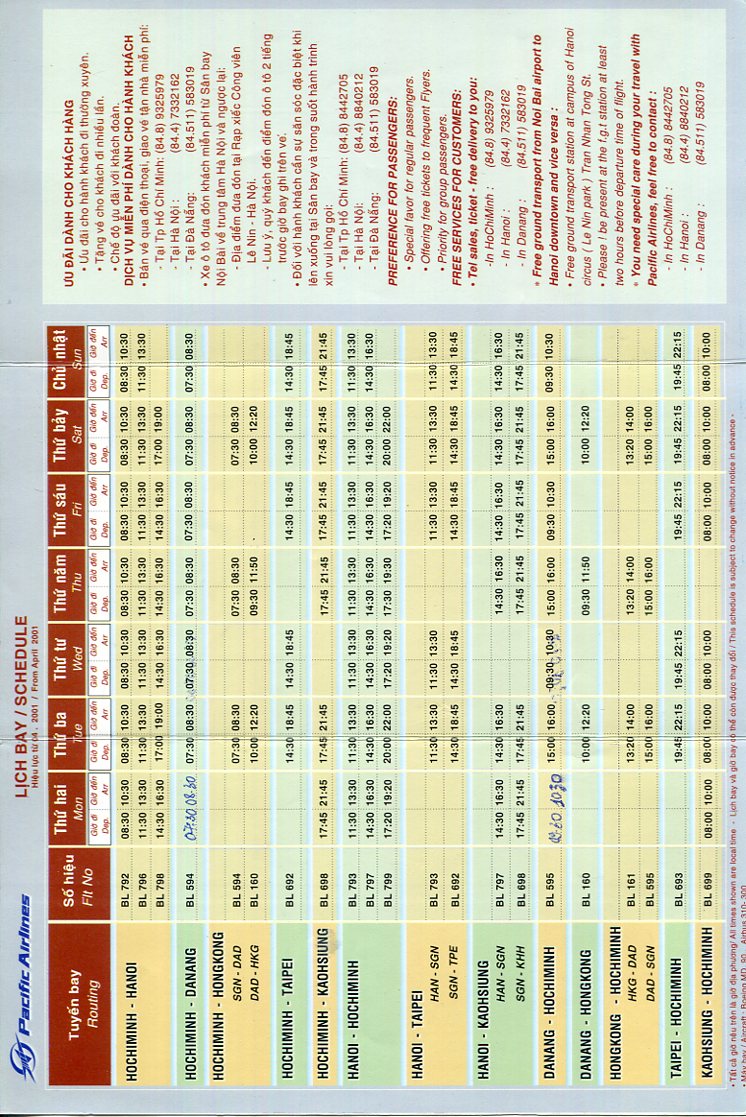 TAB33. | Pacific Airlines , A Pacific Airlines of Vietnam schedule dated April 2001. TT measures 3 7/8" x 7 3/4" with three paneld. Started operations Operations started in 1991 began operations in 1991, flying chartered cargo services, used Schedule | EX $12.00 |