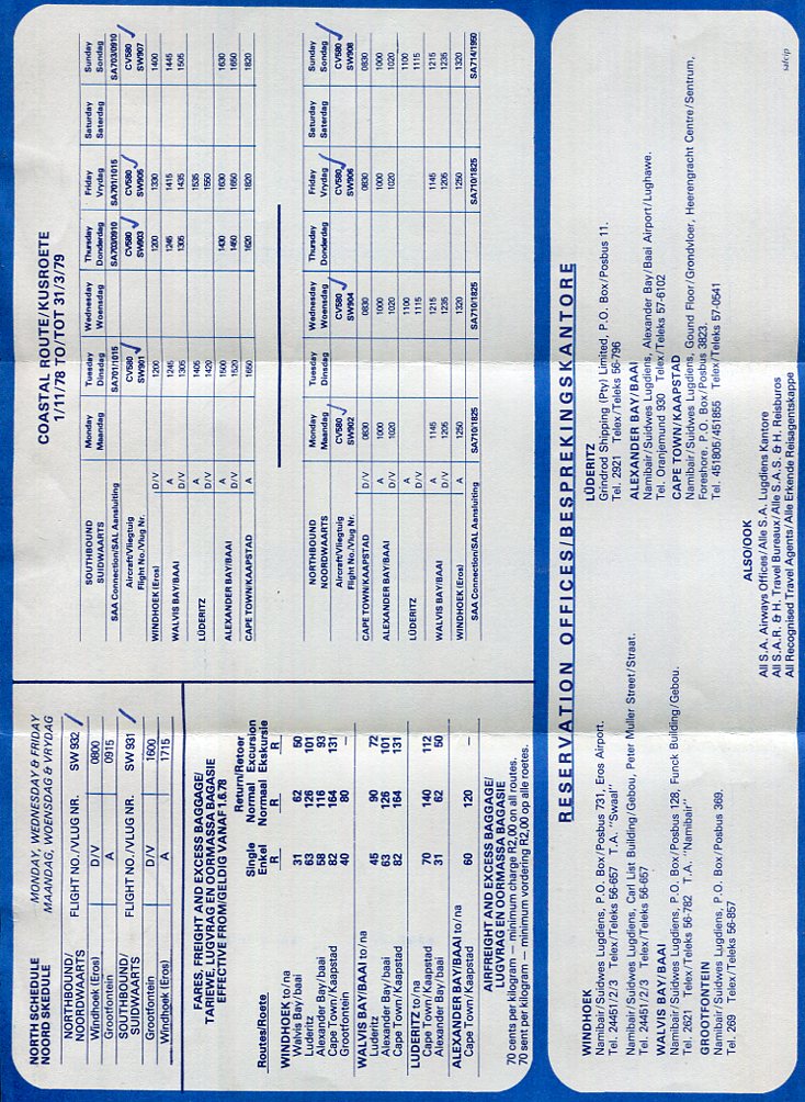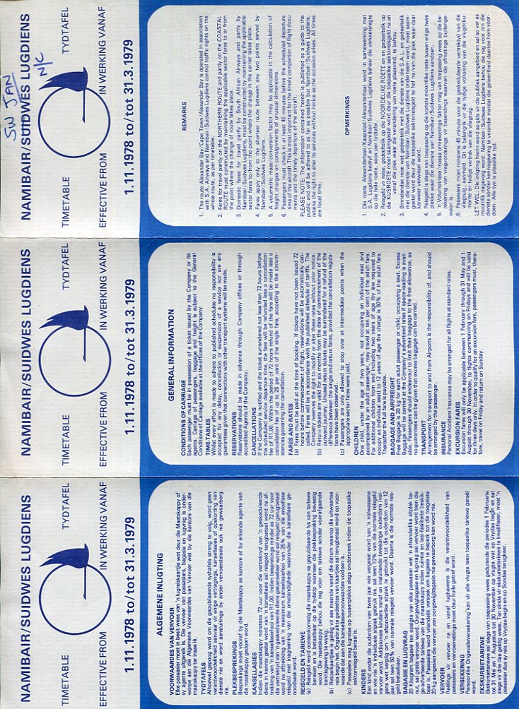 TAB35. | Namibair/Suidwes Lugdiens , A Namibair?Suidwes Lugdiens(translate to Southwest Airlines) schdule dated 1/11/1978. TT measures 3 1/2" x 7 3/4", with three panels. I think the writing must have been done by a passenger(?), used Schedule | EX $9.00 |