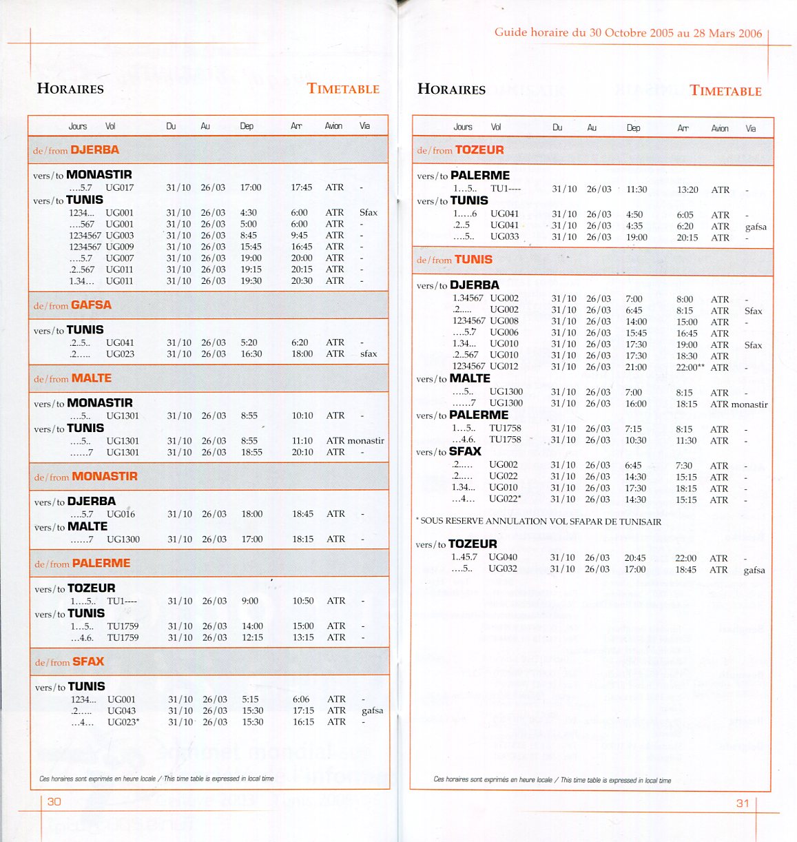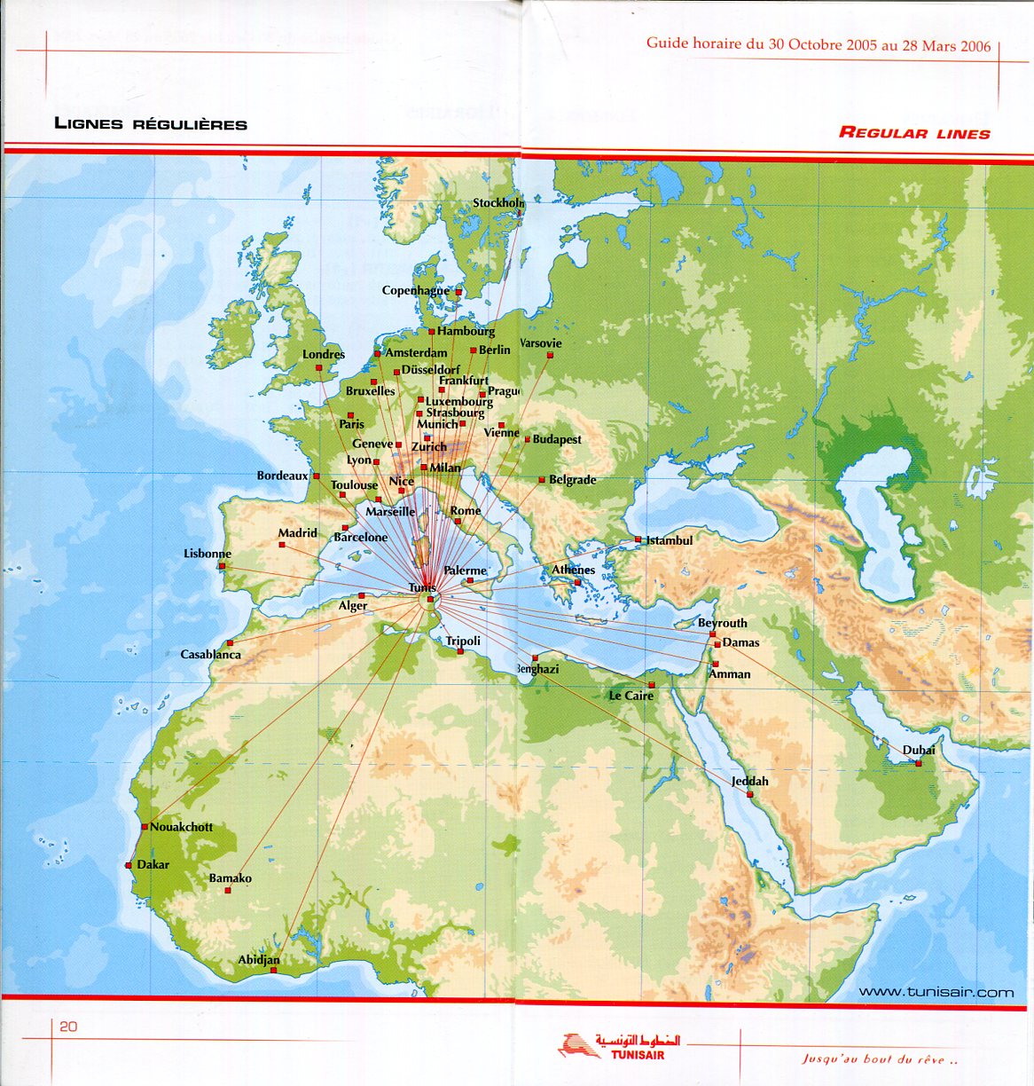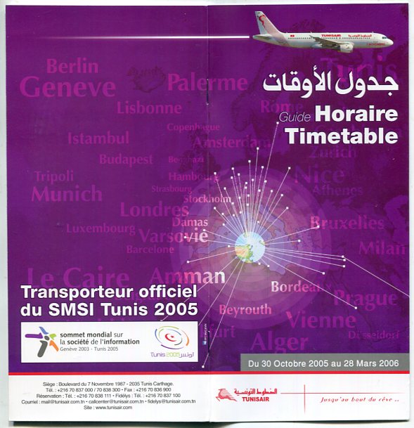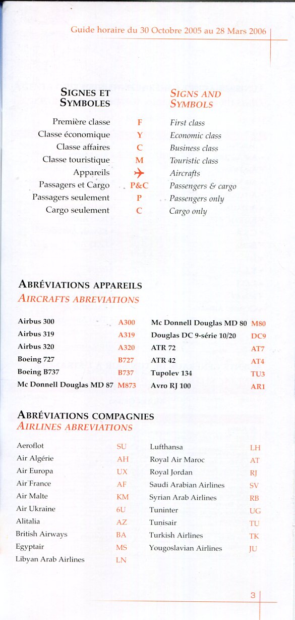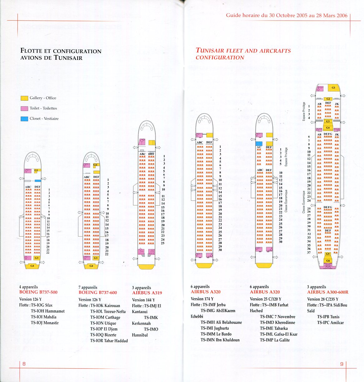 TAB36. | Tunisair, A Cool covered Tunisair system schedule dated October 20,2005. TT measures4" x 8 1/4" with 43 pages, used Route Map , Fleet Cut-A-Ways , Abbreviations , Sample Schedule , Sample Schedule | EX $4.00 |