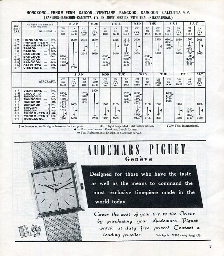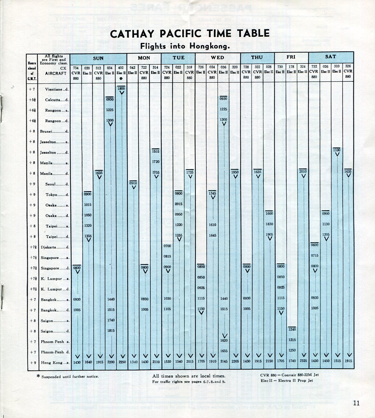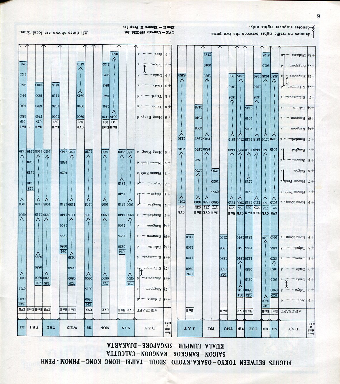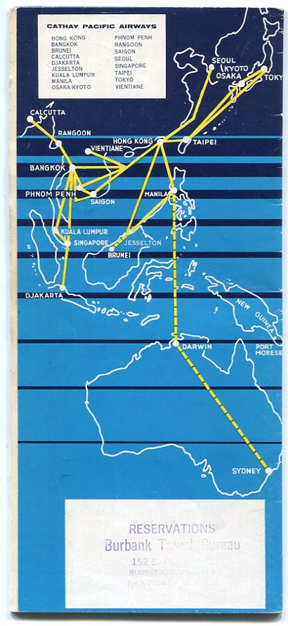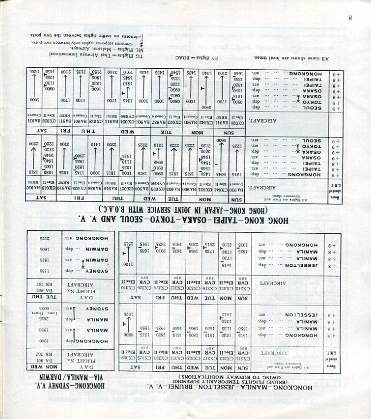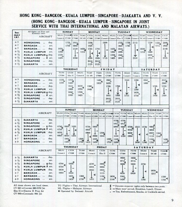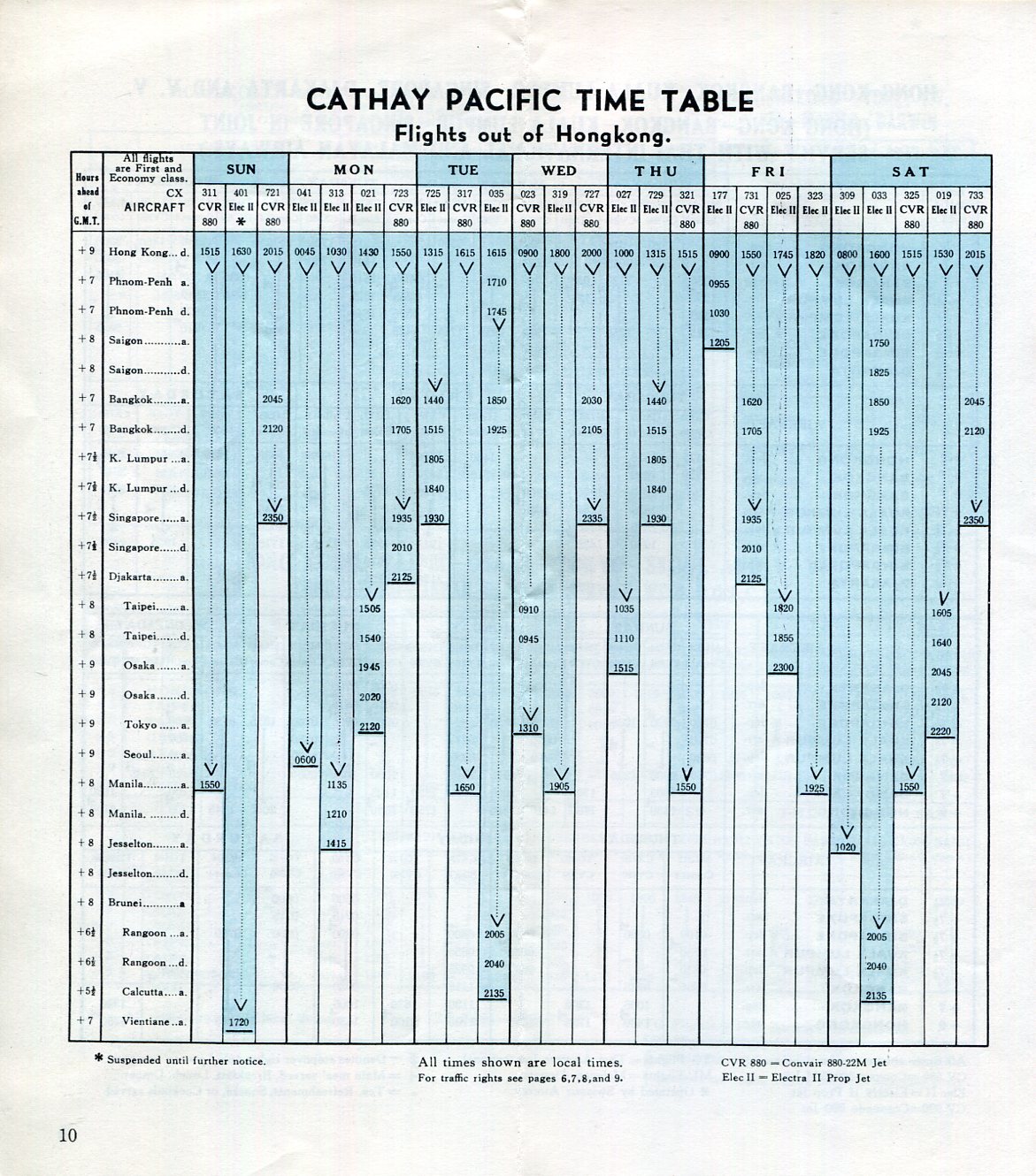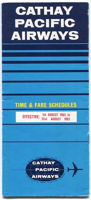 | TAB37. | CPA , A CPA, Cathay Pacific Airilne system schedule dated August 1,1963. TT measures 4" x 9", four paneled with 19 pages. Has light+ cover wear. Operating Convair 880-22Ms and L-188 Electra II's. Has other Airline schedules shown with Aircraft types, used Route Map , Schedule , Schedule , Schedule , Schedule , Schedule , Schedule , Schedule | VG $18.00 |