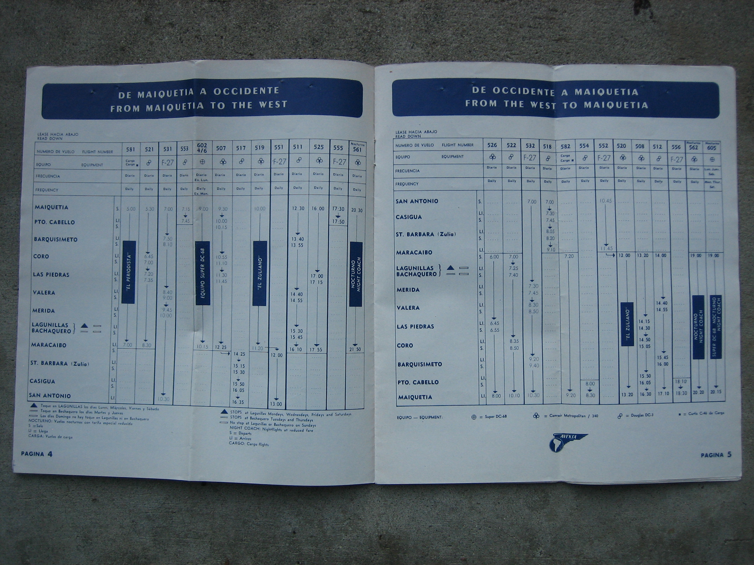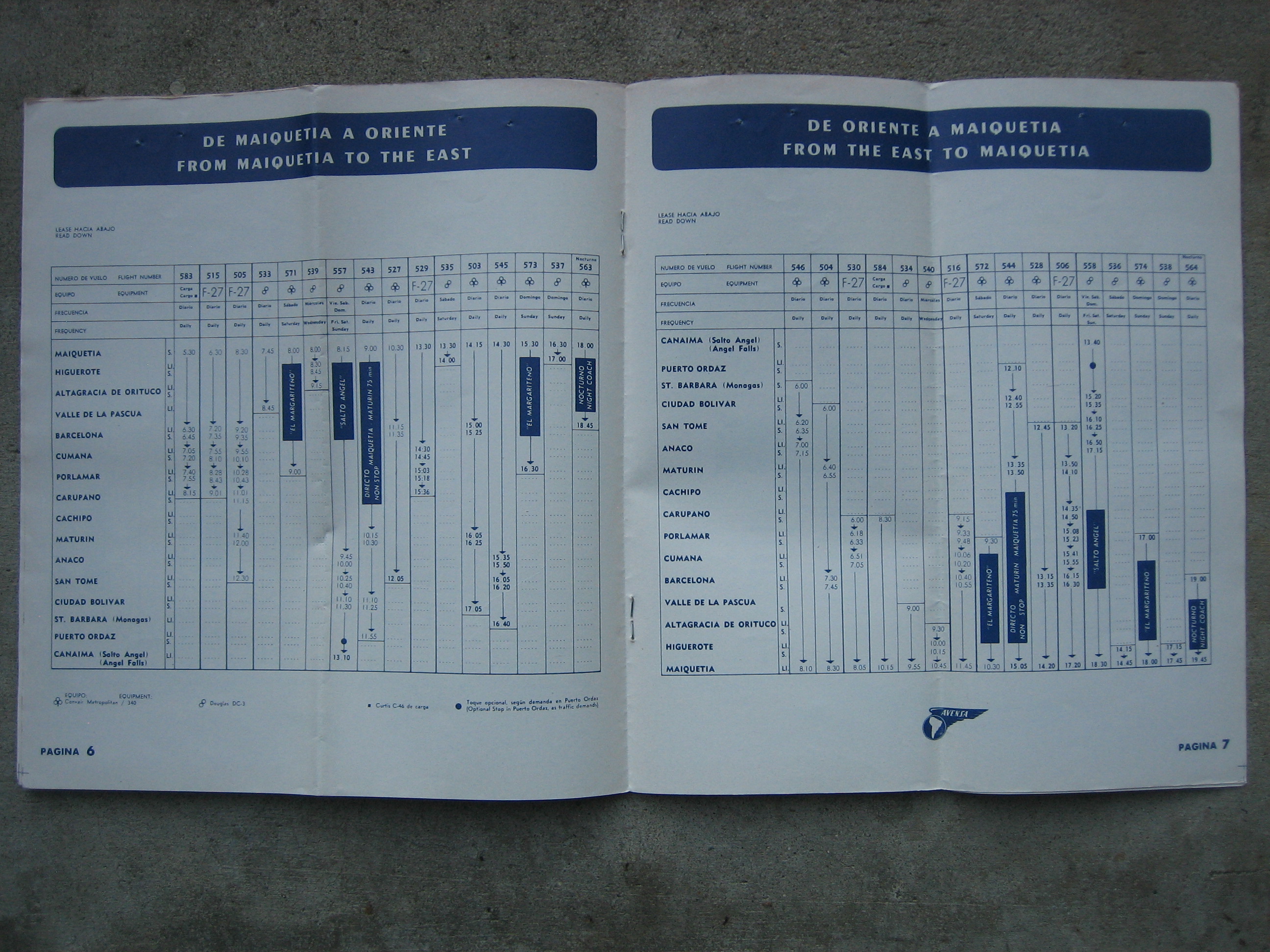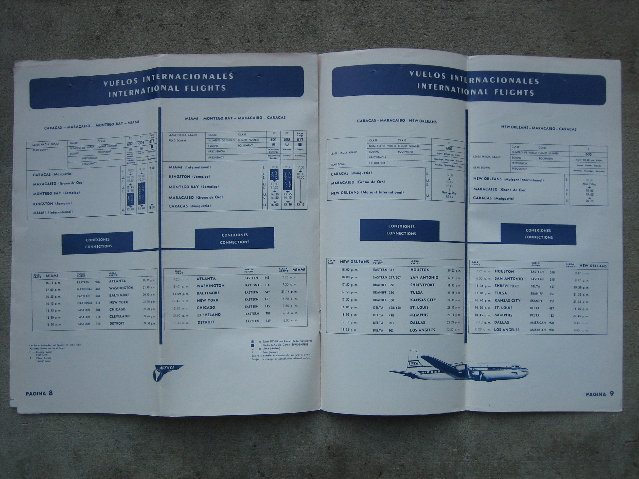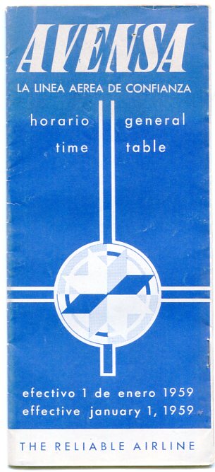TAB39. | AVENSA , A AVENSA system schedule dated January 1,1959. TT measurses 4" x 9", four paneled with eleven pages. Has Moderate cover wear and one staple hole, used Indentation Writing , Schedule , Schedule , Schedule , F-27s , Route Map | G $10.00 |