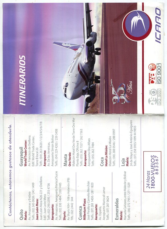 TAB40. | ICARO , A Very RARE, as it's the only copy I know of, and COOL B-737-200 covered ICARO of Ecuador schedule, which is undated, BUT C.2006. TT measures 4" x 5 7/8" and two paged, with a vertical crease running through the left engine. ICARO was formed in 1971 as ICARO Express (Instituto Civil Aeronautico). On Juun 20, 2011 Icaro filed for bankruptcy and ceased there domestic services, ICARO was base in Quito, used | VG $25.00 |