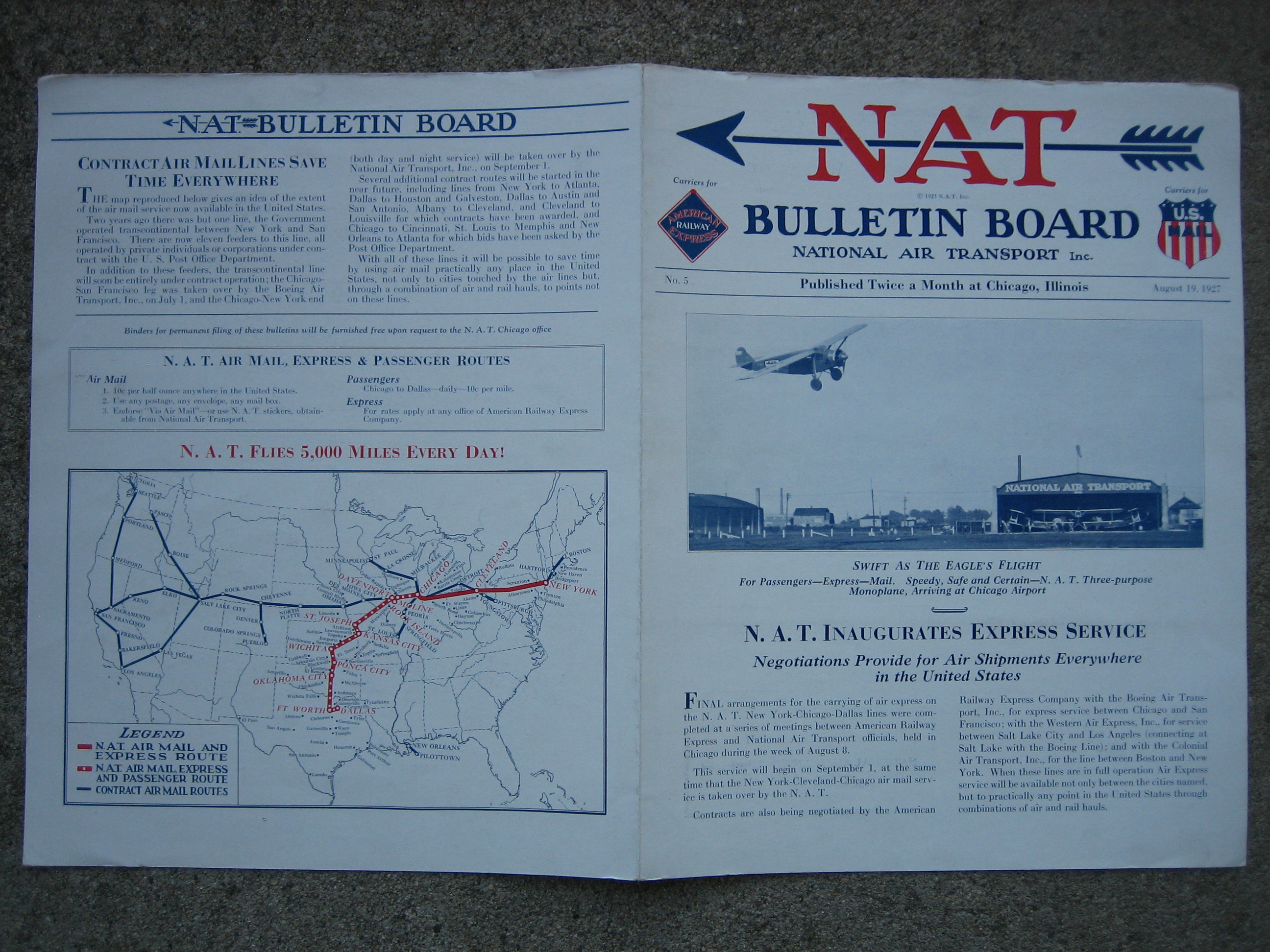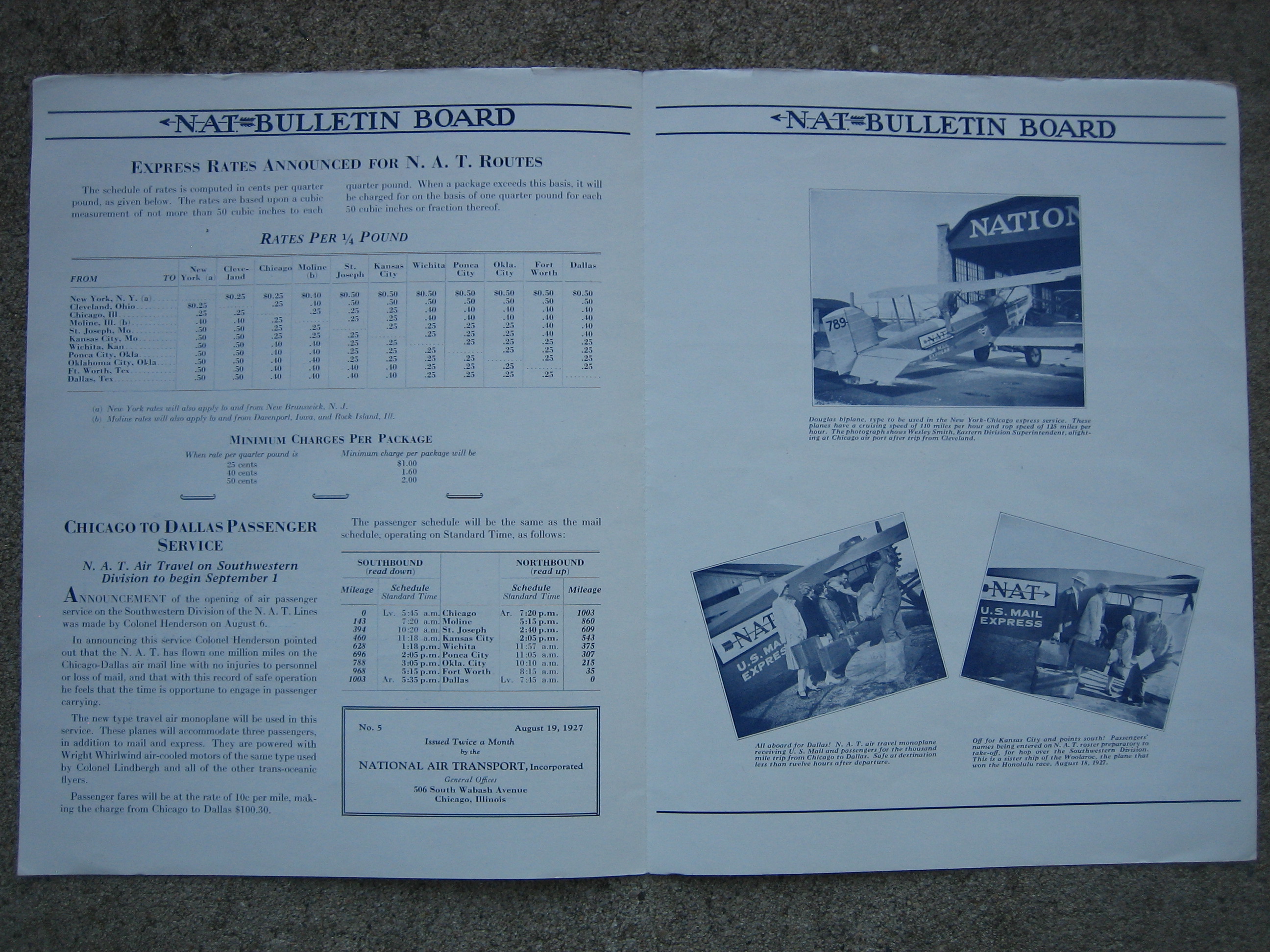 TAB41. | N.A.T. , A Very early and RARE National Air Transport brochure/passenger/mail schedule dated August 19, 1927. Item measures 8 1/2" x 11" with four total pages, used Informations & Schedule | EX $58.00 |