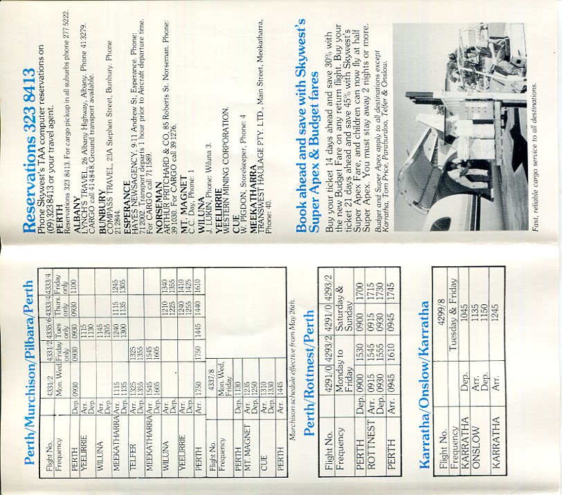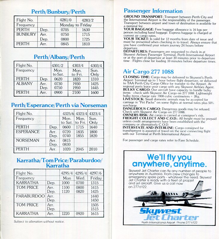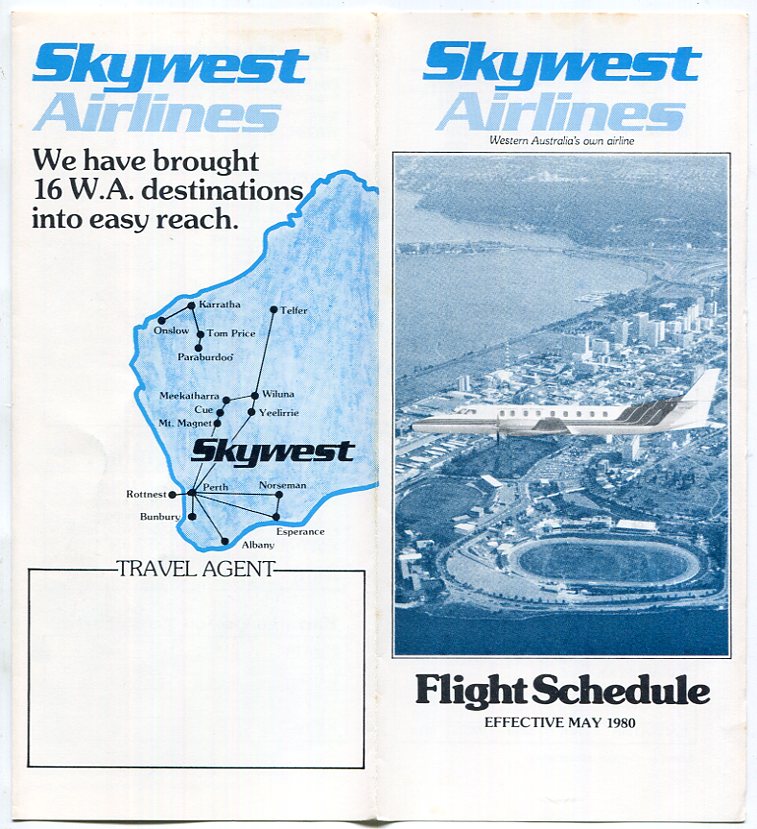 | TAB42. | Skywest Airlines , A Very Scarce and earliest known Skywest Airlines of Australia commuter schedule dated May 1980. TT measures 3 7/8" x 8 5/8" with three panels. There is a duplicate of this schedule shown on timetableimages.com. Skywest Airlines was formed in 1963 as Carnarvon Air Taxis flying charter flights with small general aviation aircraft out of Carnarvon, Western Australia. In 1979 it changed its name to Skywest Aviation and moved to Perth’s Jandakot Airport. Renamed to SkyWest Airlines on February 18,1980, used Schedule & Information , Schedule & Information | EX $17.00 |