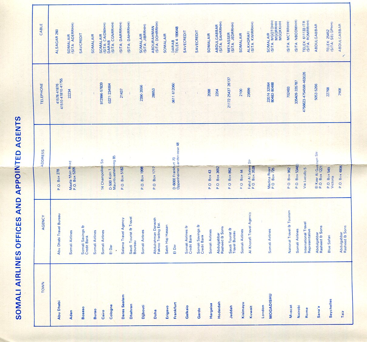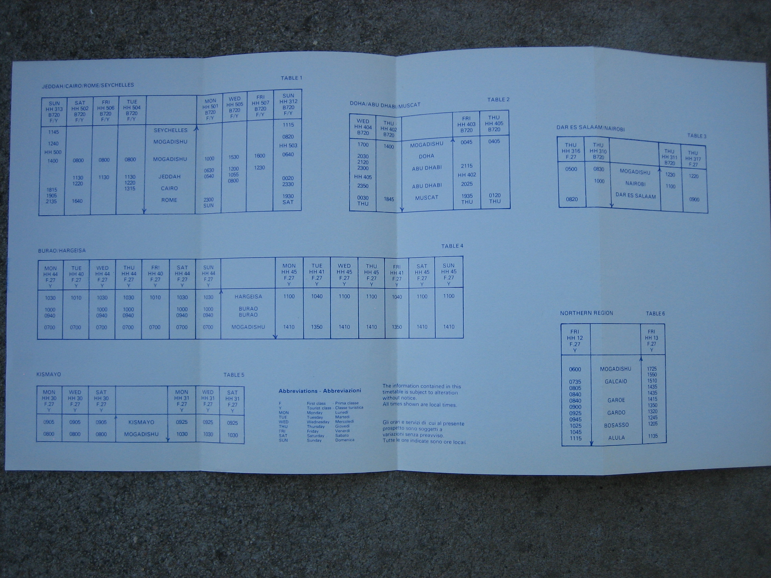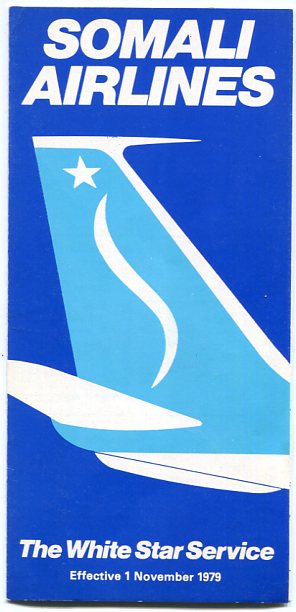 TAB43. | Somali Airlines , A Scarce Somali Airlines system schedule dated November 1,1979. TT measures 4" x 8 1/4" with four panels. Operating B-720s and F-27s, used Schedule | EX $29.00 |