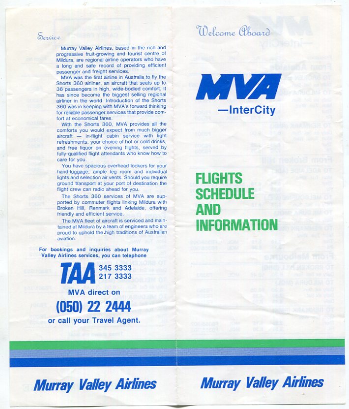 TAB44. | Murray Valley , A MVA, Murray Valley Airlines InterCity(?) of Australia schedule, C. mid.'80s. TT measures 3 1/2" x 8 1/2", and two paged. Has moderate cover wear, and two horizontal creases: one is light, the other is more distinctive. NOT SURE WHAT "InterCity" MEANS HERE AS IT LOOKS LIKE A SYSTEM TO ME, Schedule | G $4.00 |