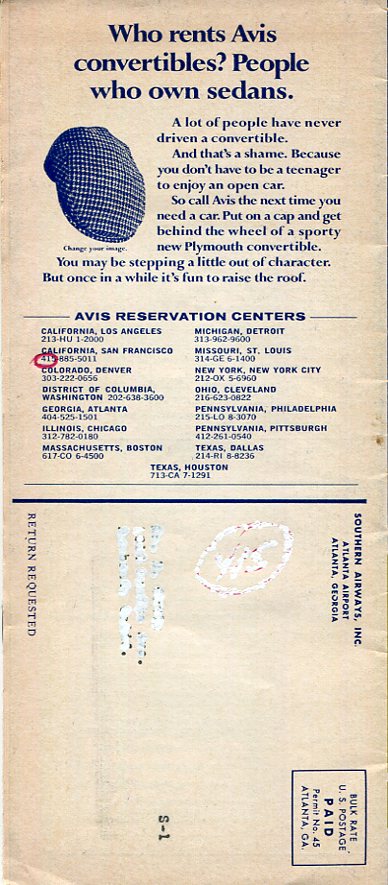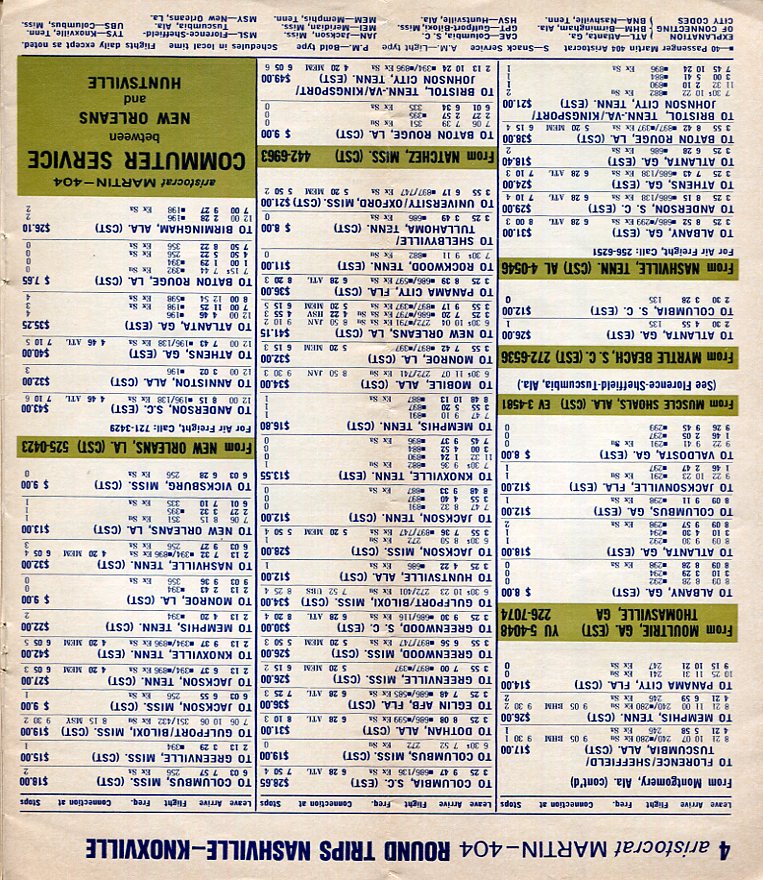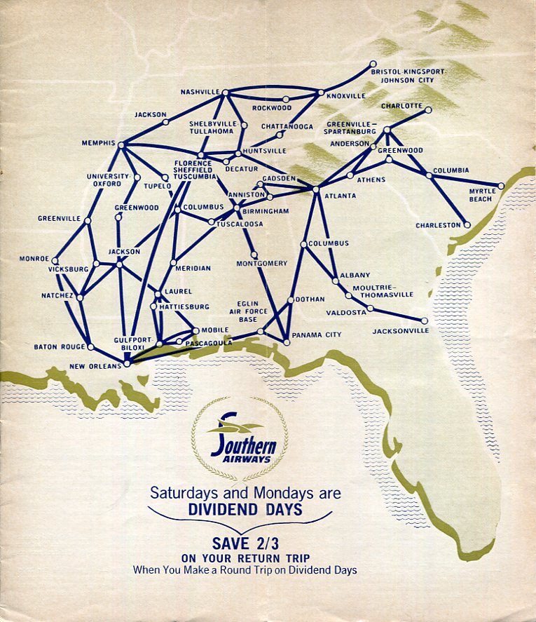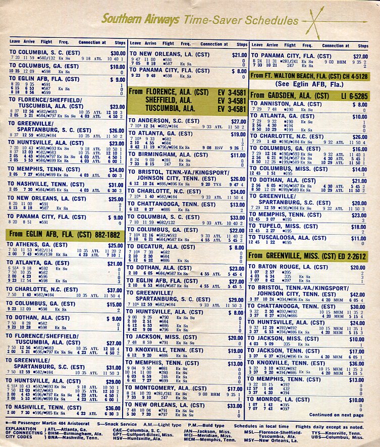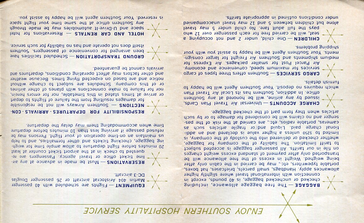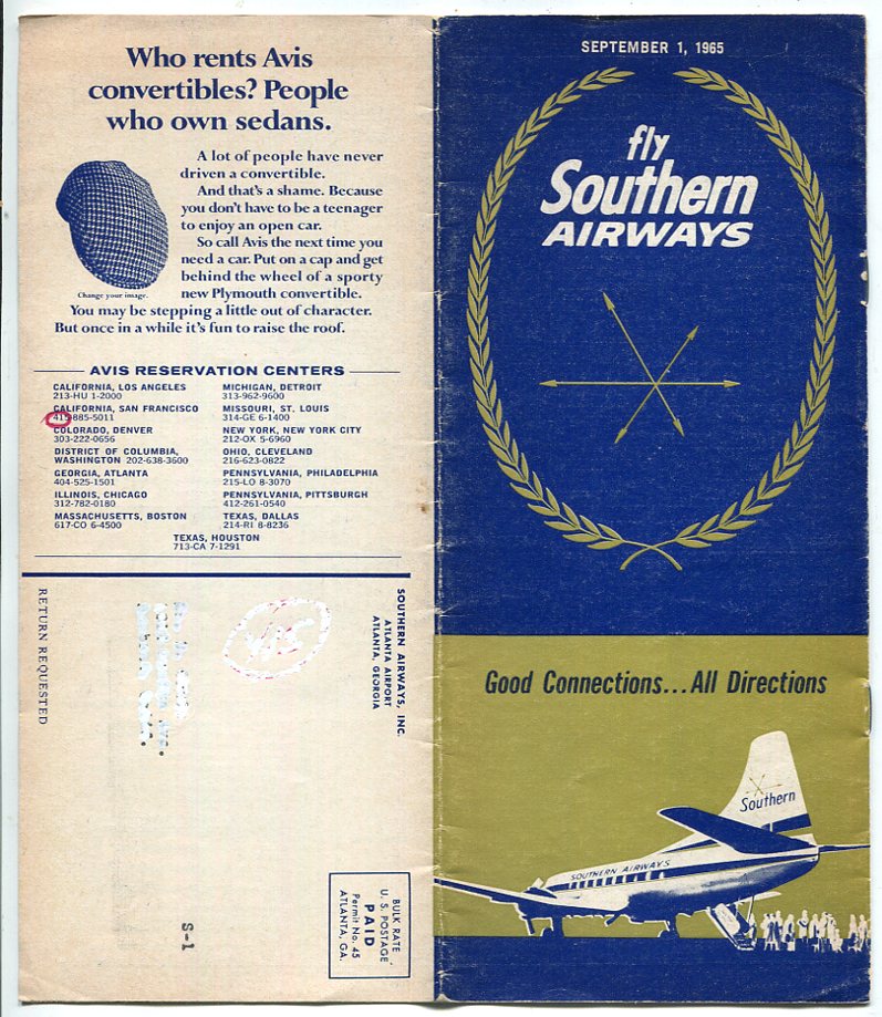 | TAB45. | Southern Airways , A Southern Airways system schedule dated September 1,1965. TT measures 4" x 9", four paneled with thirteen pages. Has Front and Back cover wear, used Route Map , Information , Sample Schedule , Sample Schedule , Basck Cover | VG $10.00 |
