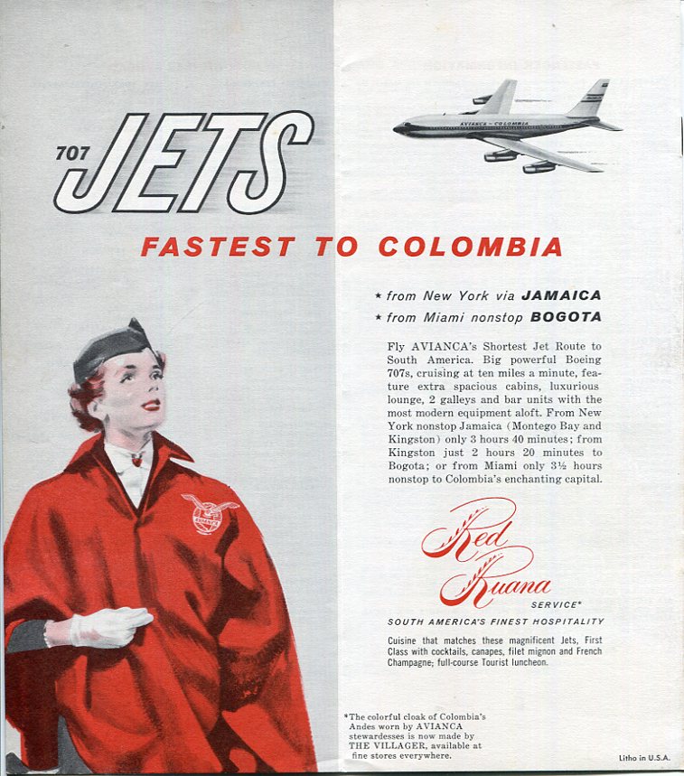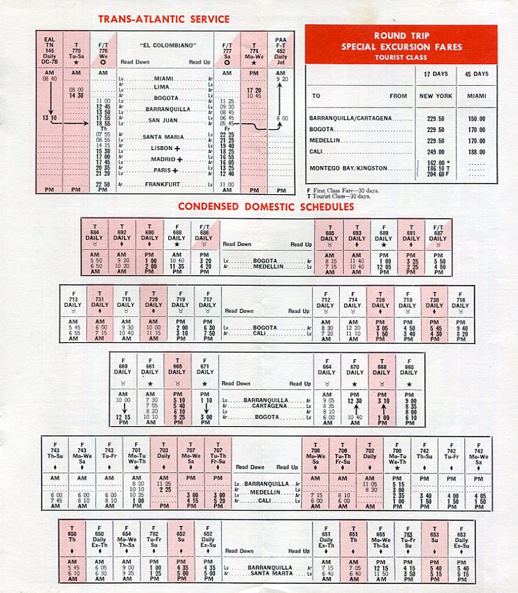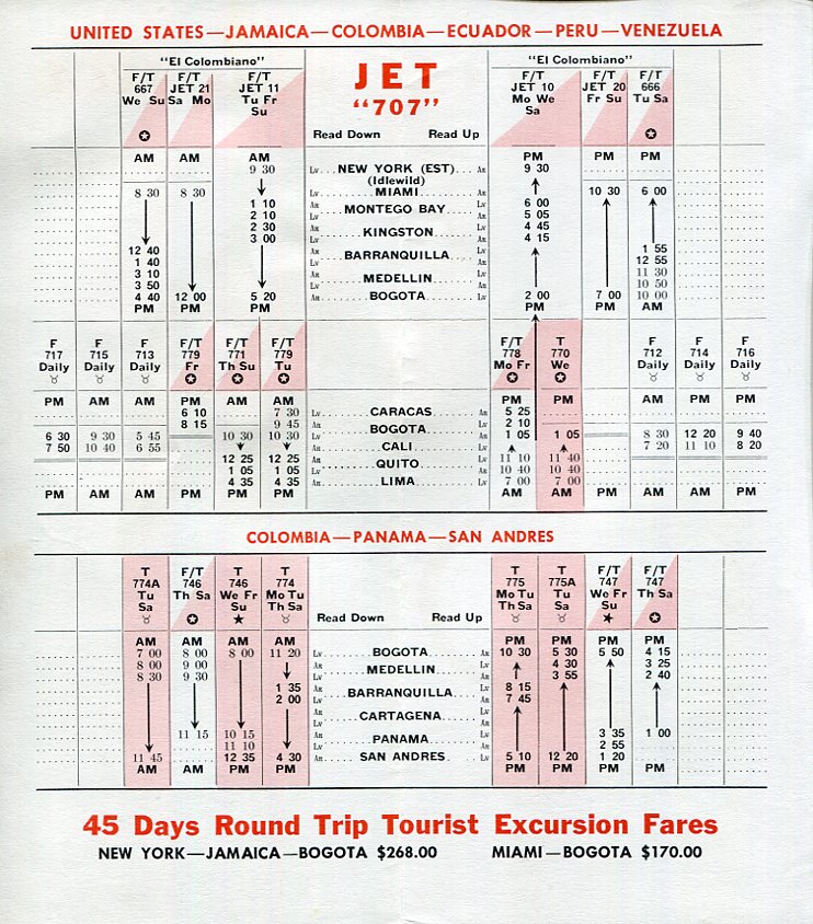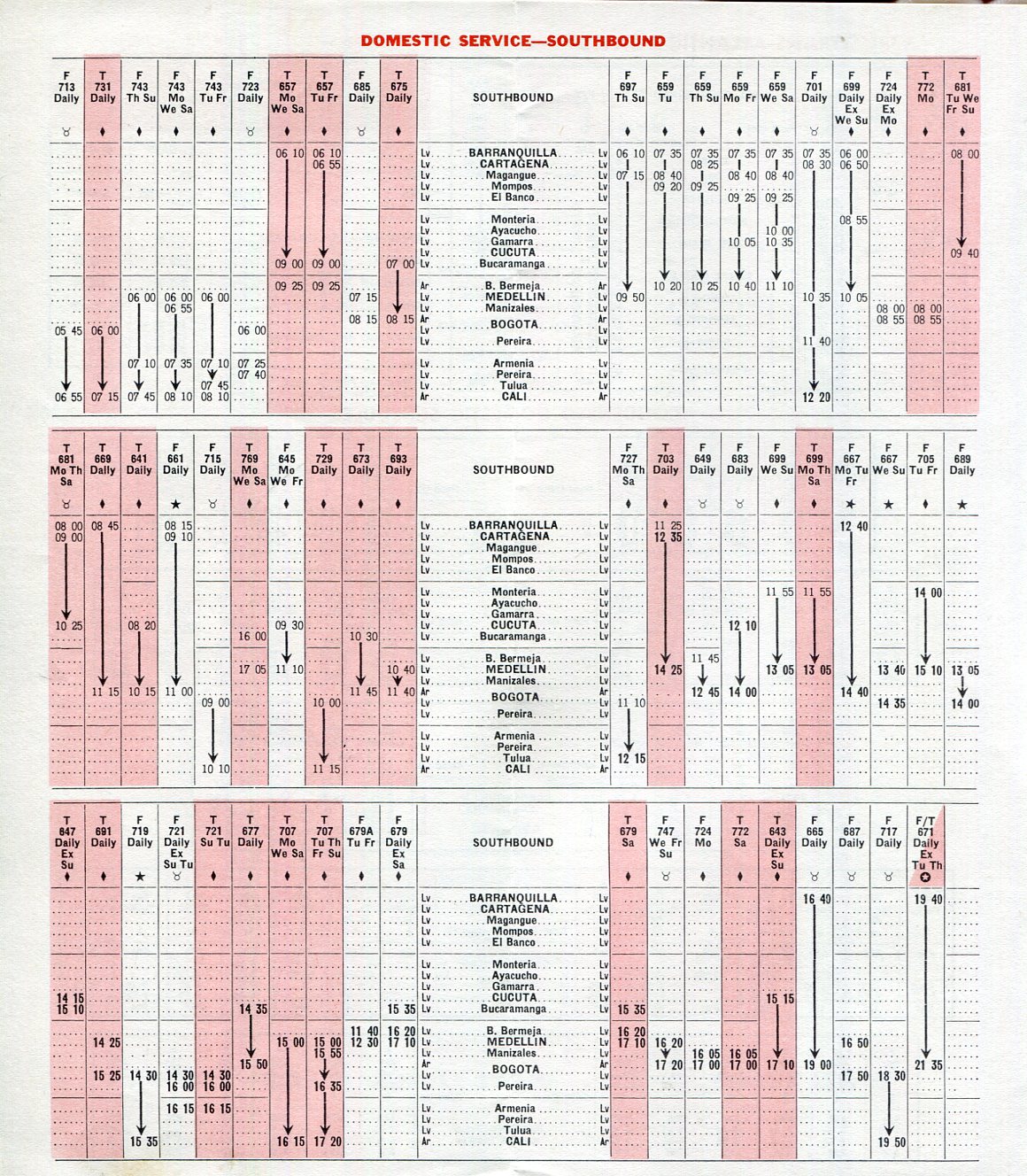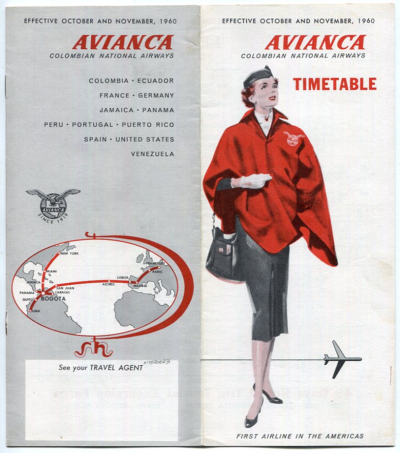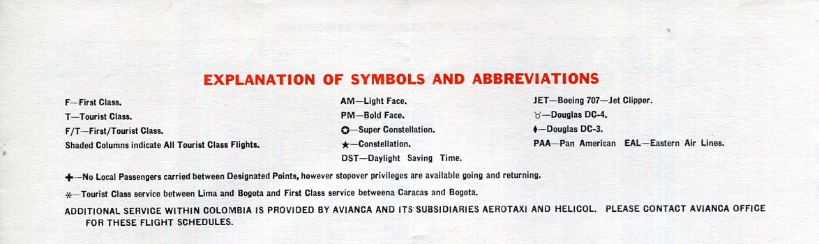TAB5. | AVIANCA , A Cool AVIANCA, Colombian National Airways system schedule dated October/Nov. 1960. TT measures 4" x 9" with 6 total inside pages. Operating B-707s, Super Constellations, Constellations(L-749s), DC-4s and DC-3s. I FOUND INFORMATION STATING THEY STARTED B-707 ON DECEMBER 15, 1960. I BELIEVE THIS IS THE "INAUGURAL" B-707 SCHEDULE FOR AVIANCA. , used Fastest to Columbia , Symbols & Abbreviations , Schedule , Schedule , Schedule | EX $25.00 |