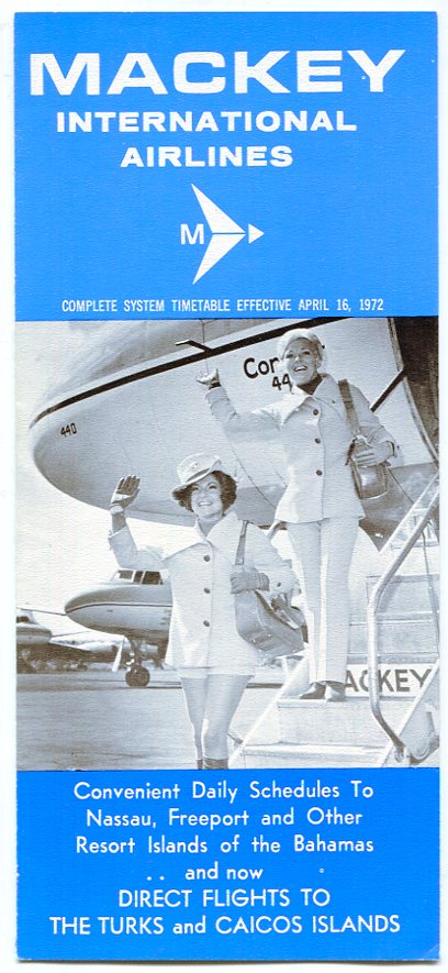 | TAB6. | Mackey International , A Super Cool Stewardess/Convair 440 covered Mackey International Airlines system schedule dated April 16,1972. TT measures 4" x 9" with four panels, used Route Map , Schedule , Schedule | EX $14.00 |