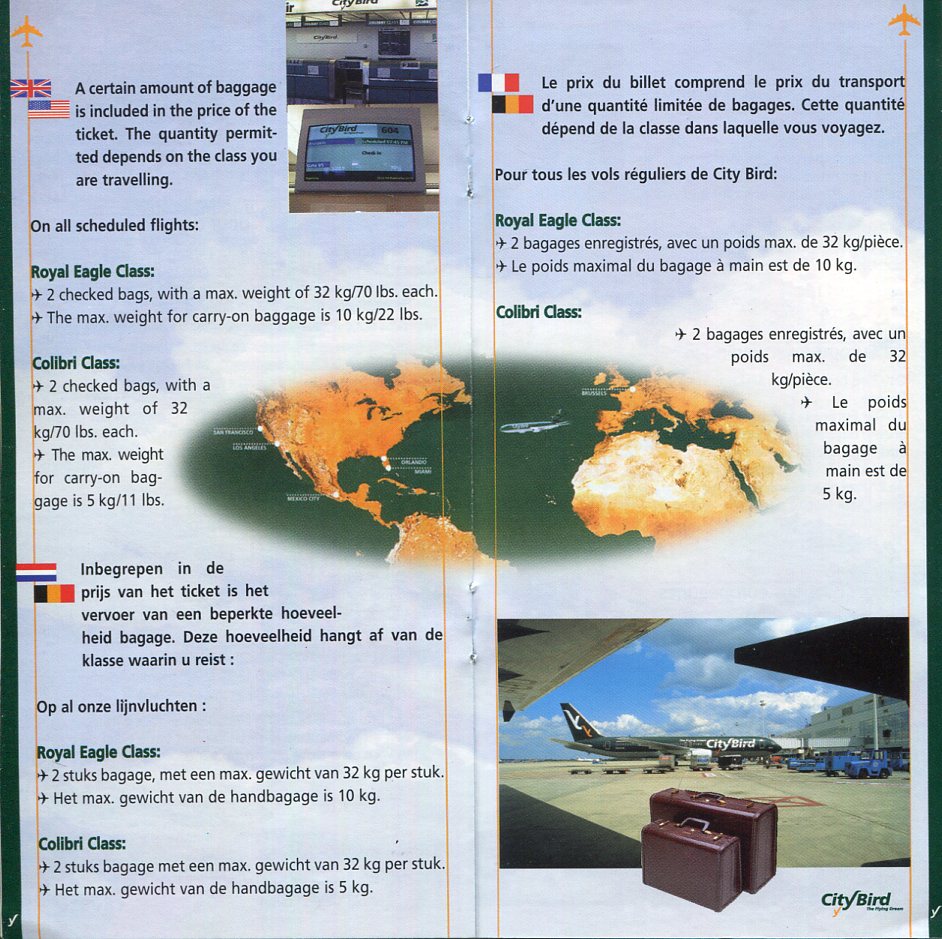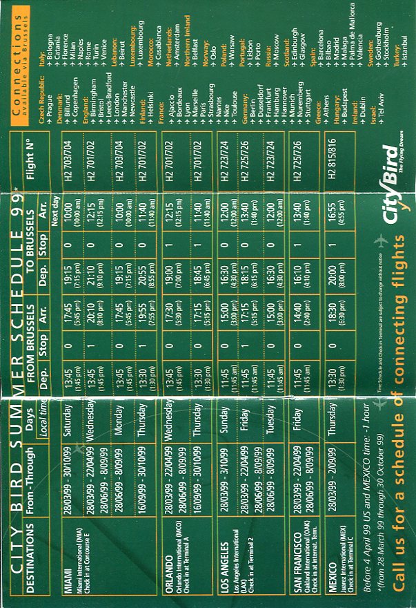 | TAB7. | City Bird , A Cool MD-11(w/back cover) covered City Bird of Belgium schedule dated March 28,1999. TT measures 3 1/8" c 6 1/4" with 12 pages. Parts are written in French, German and English. They founded in 1996 and based at Melsbroek Air Base in Zaventem. The airline filed for bankruptcy in October 2001. City Bird operated a fleet of twelve aircraft including the Boeing 767-300ER, various Boeing 737 variants and the Airbus A300-600R and the McDonnell Douglas MD-11, used MD-11 Image w/Back cover , Some Information , Some Information , Schedule | EX $4.00 |