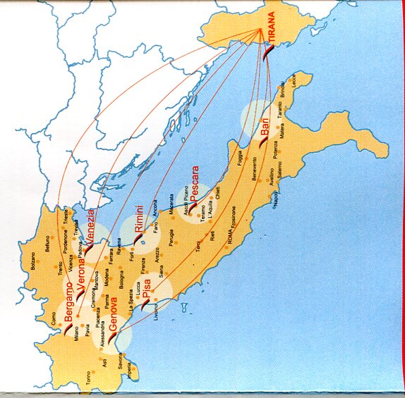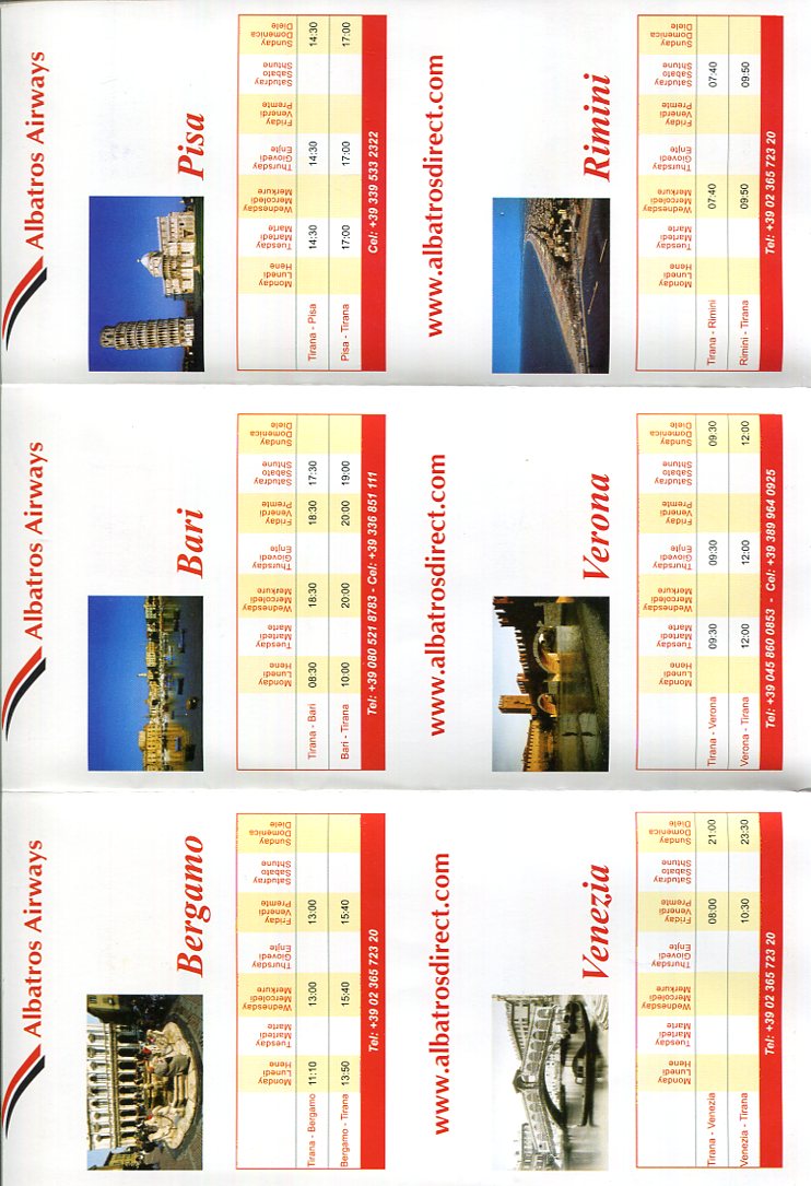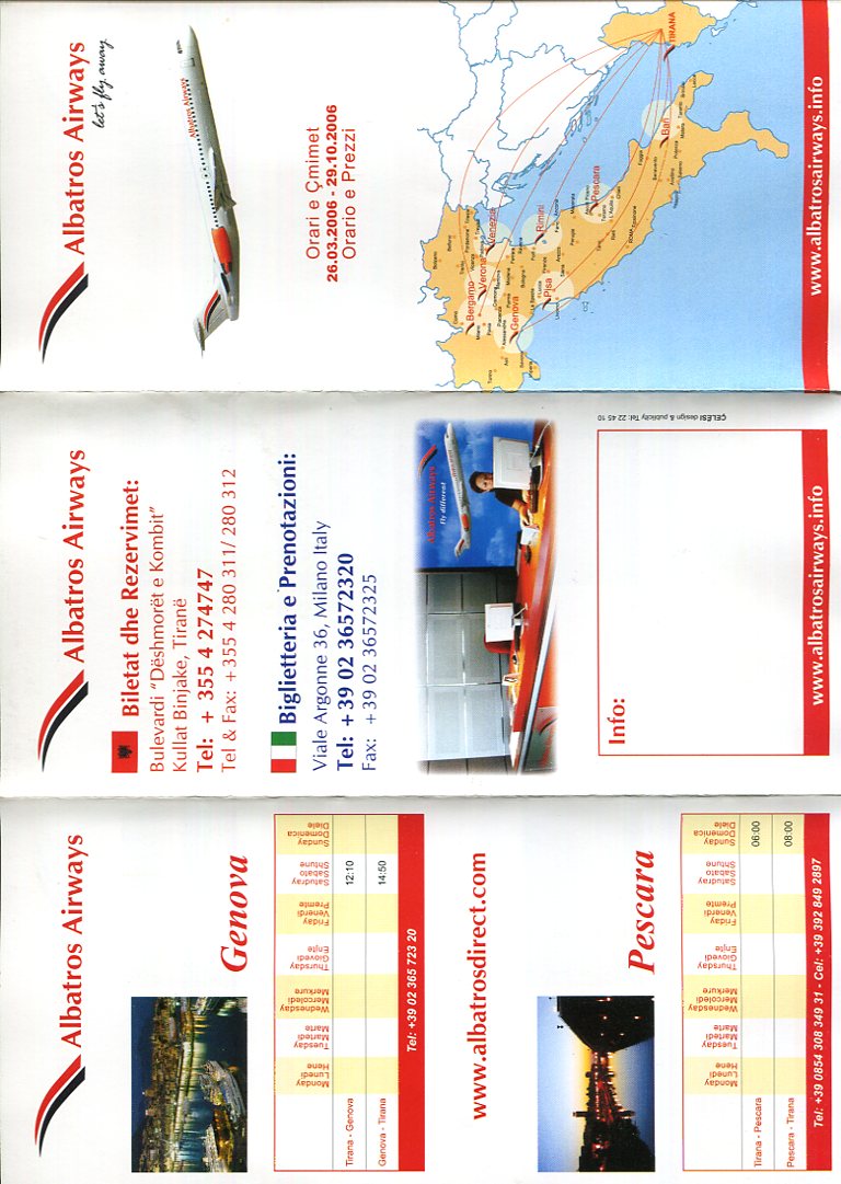 TAB8. | Albatros , A Scarce Albatros Airways of Albania schedule dated March 26, 2006. TT measures 3 7/8" x 8" with three panels. They started operations on started operations on November 3, 2004, and ceased operations September 1,2006 by the Albanian aviation authorities because of unpaid airport and air traffic control fees. Albatros flew to destinations in Italy using Fokker 100 aircraft. THERE IS ONE DUPLICATE COPY ON TIMETABLEIMAGES.COM=NO OTHERS LISTED, used Up Close View of Route Map , Schedule | EX $14.00 |