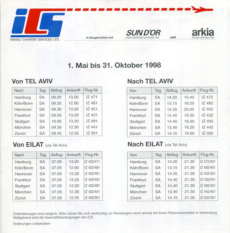 | TAB9. | ICS , A Scarce ICS, Israeli Charter Service Ltd. schedule dated Summer 1998. TT measures 4" x 8 1/4" and two paged. ICS was a joint operation of El Al (through its subsidiary Sun d'Or International Airlines) and Arkia Israeli Airlines, using Arkia's flight prefix. Ceased operations in 1998, used Schedule | EX $9.00 |