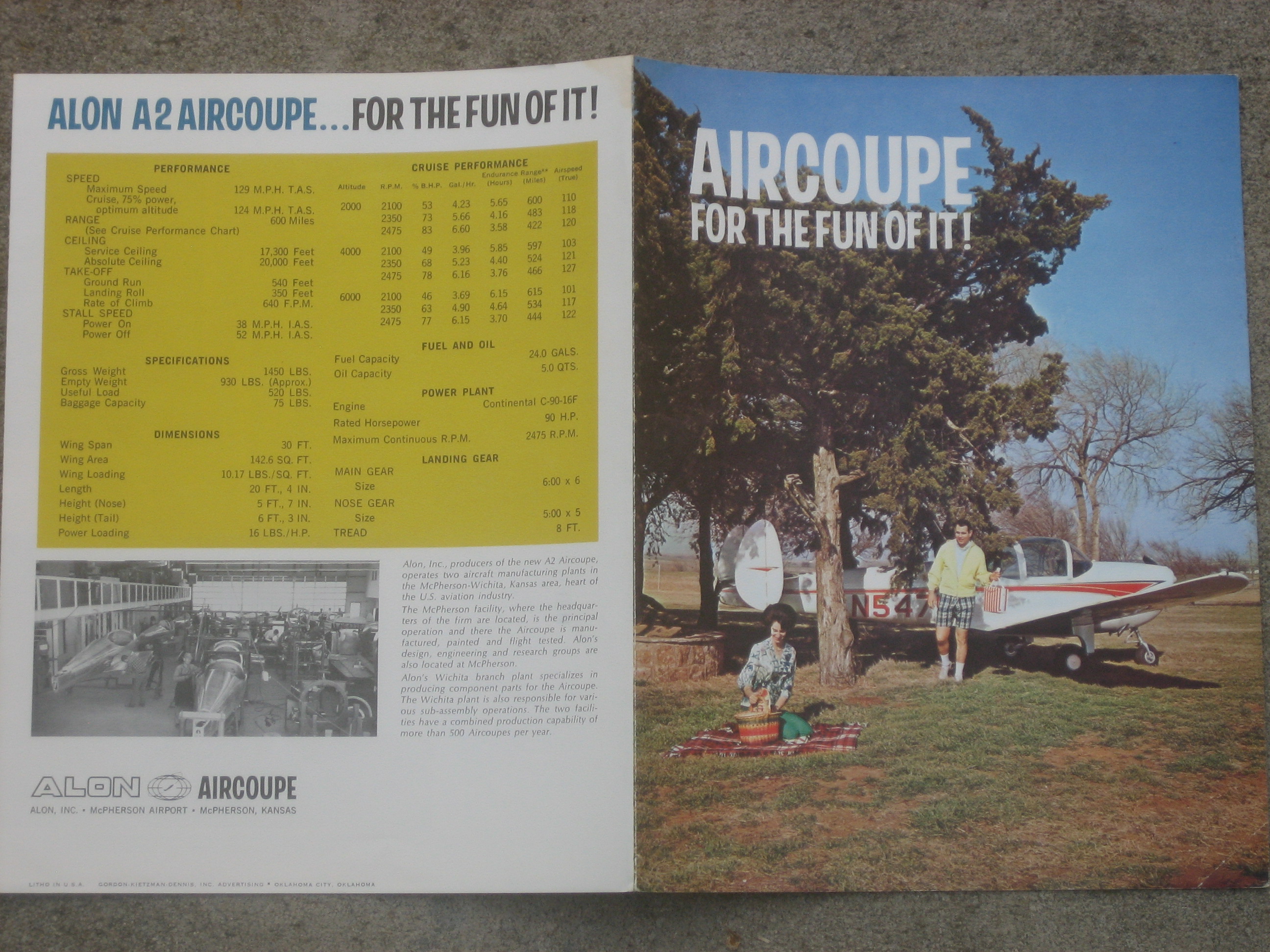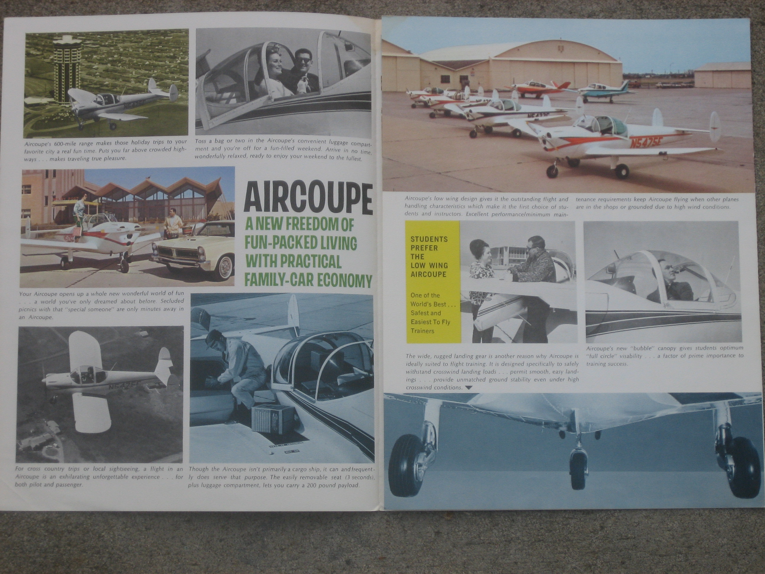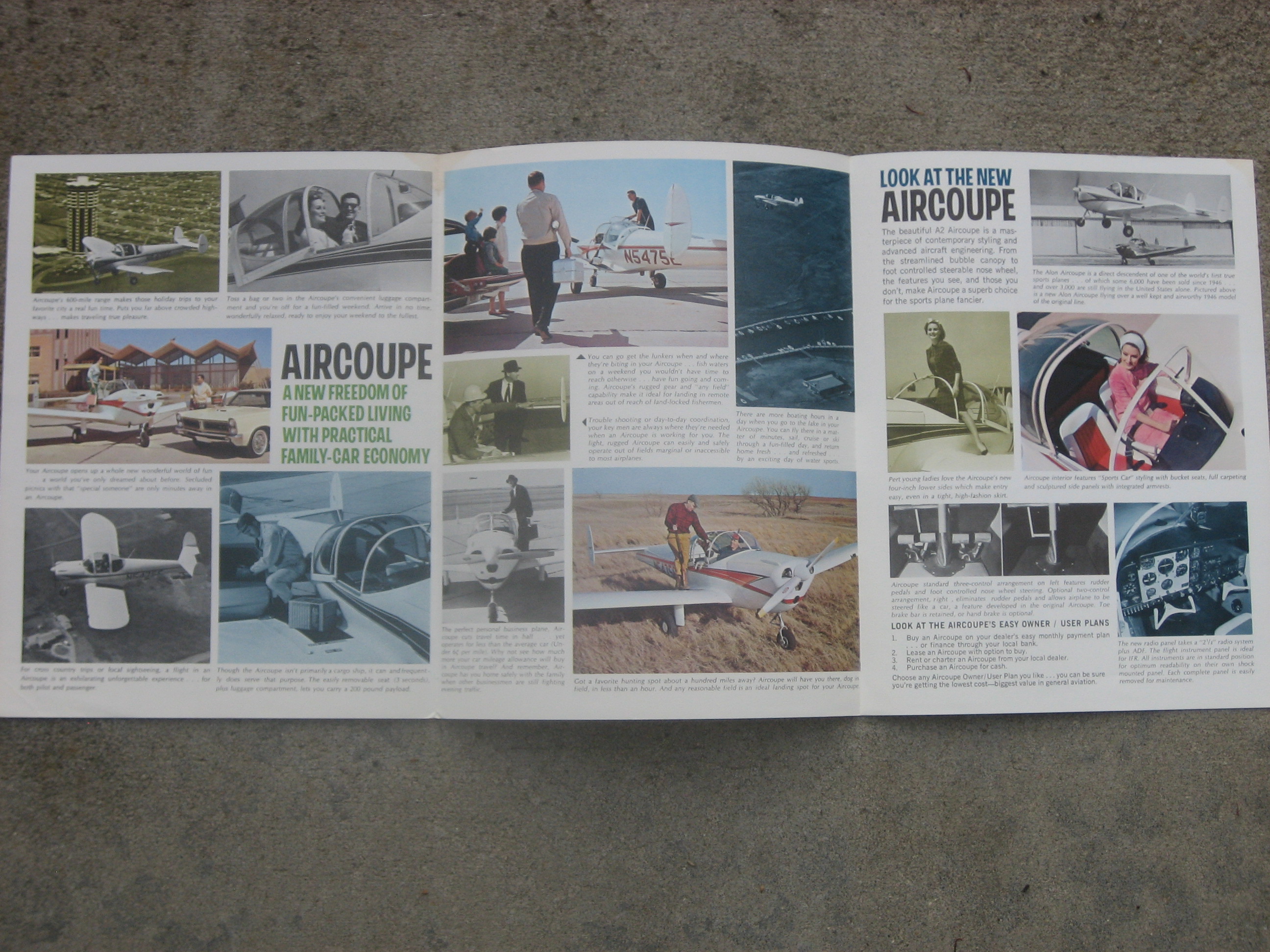| MCV3. | Alon A9 Aircoupe , A Very Scarce Alon A2 Aircoupe brochure c.1964/1967. Item measures 8 1/2" x 11" with three panels. Over the period of production (1964-1967) Alon produced 245 A-2's, with peak production of 137 in 1966. The last 25 A-2's produced by Alon had spring steel landing gear in place of the oleo struts. Production of the A-2 ceased in September of 1967, and on October 9, 1967, Alon was purchased by, and became a division of the Mooney Airplane Company of Kerrville, Texas. IF PLUS SIGN ( + ) SHOWS OVER THE IMAGE, CLICK TO MAGNIFY, used View 1 , View 2 , View 3 | EX $17.00 |