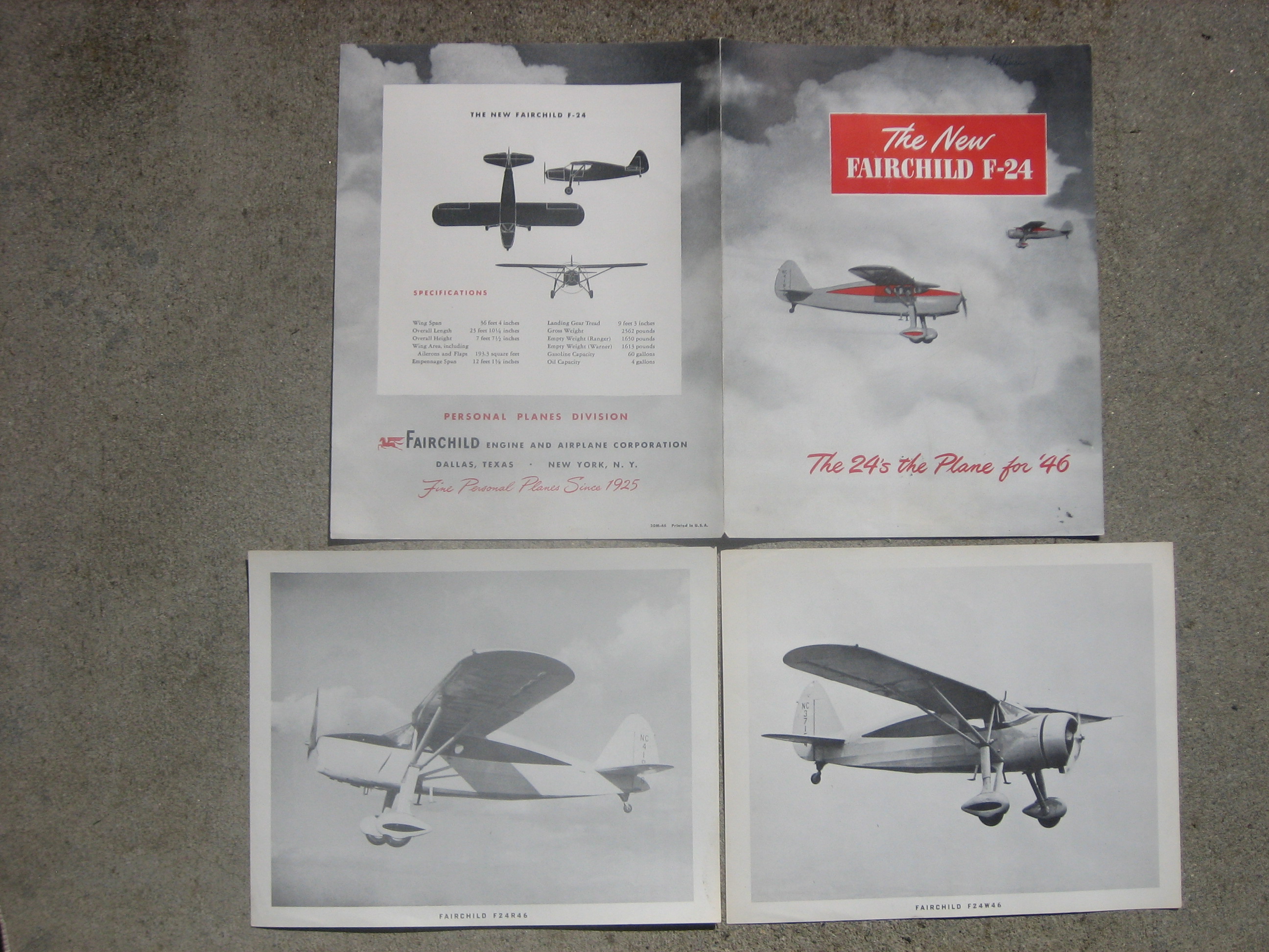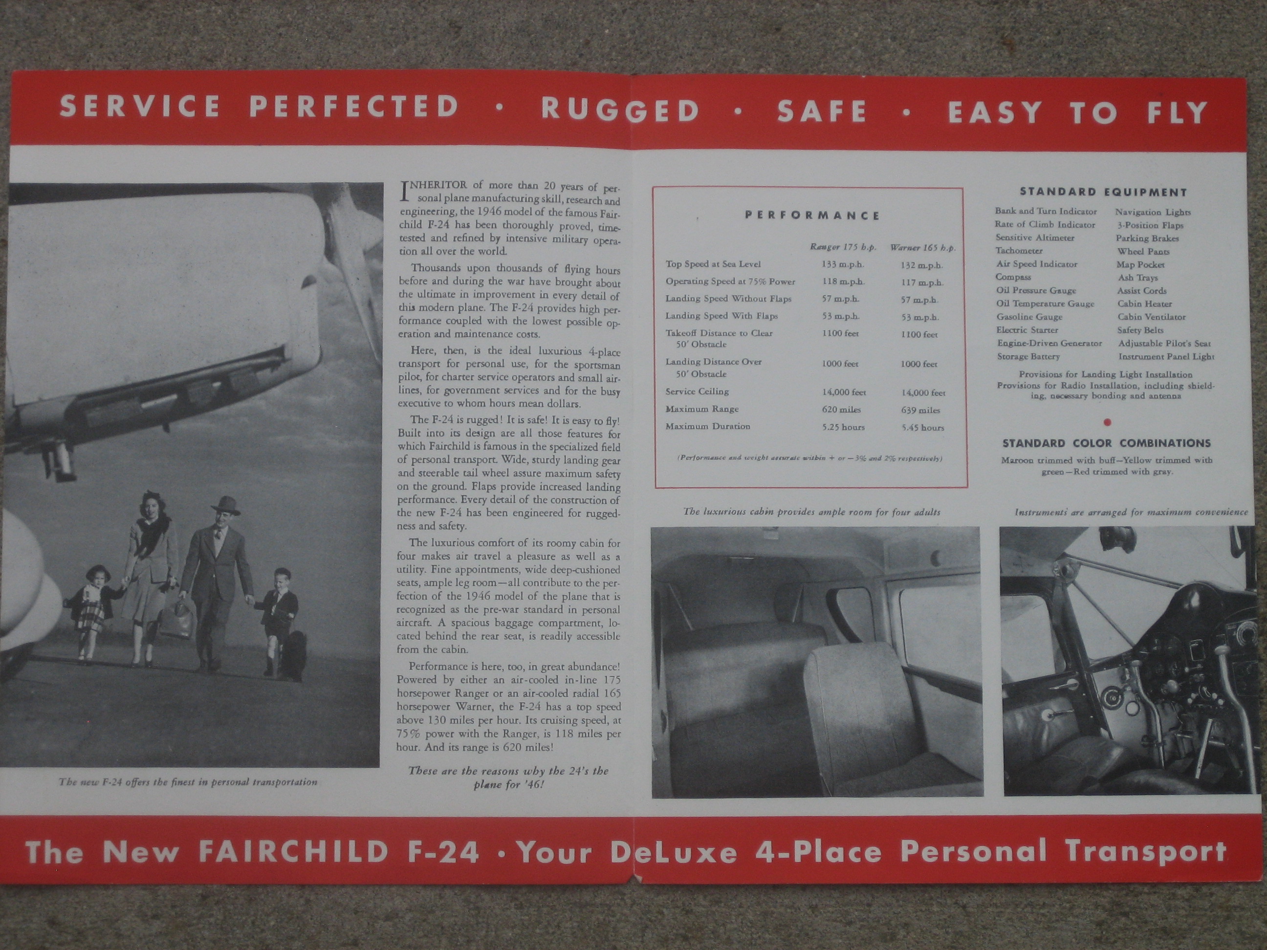 | MCV4. | Fairchild , A Cool covered, and very good+ conditioned Fairchild F-24R36 Ranger & Super Scarab F-24W36 brochure for 1946. Item measures 8 1/2" x 11", two paged and Two Excellent conditioned Prints. The prints measure 10" x 8". In 1946 Fairchild only produced the Air-cooled Radial 165-hp Warner Super Scarab F-24W36, and the air-cooled In-line 175-hp Fairchild F-24R36 Ranger. IF PLUS SIGN ( + ) SHOWS OVER THE IMAGE, CLICK TO MAGNIFY, used Inside | VG+/EX $17.00 |