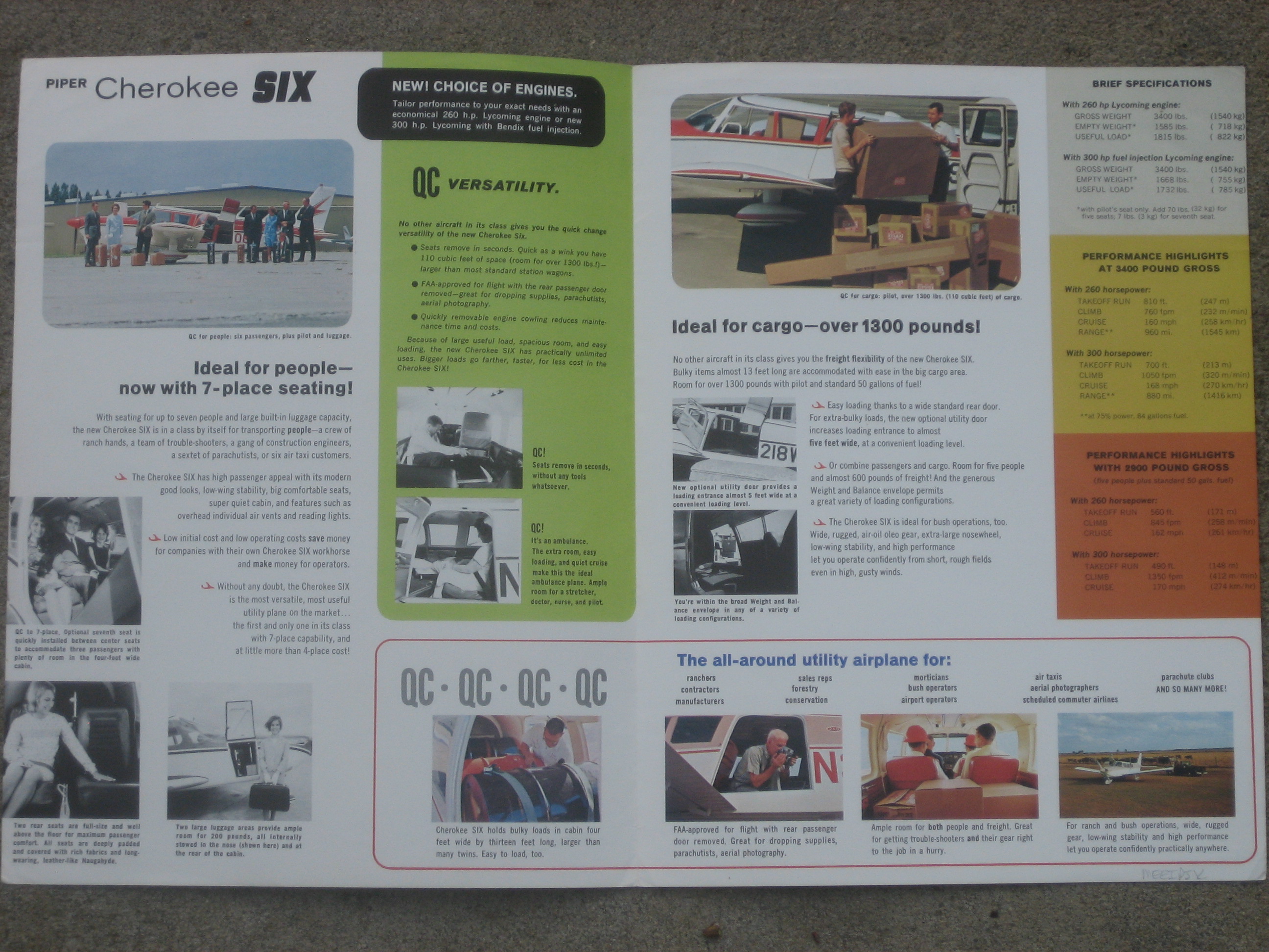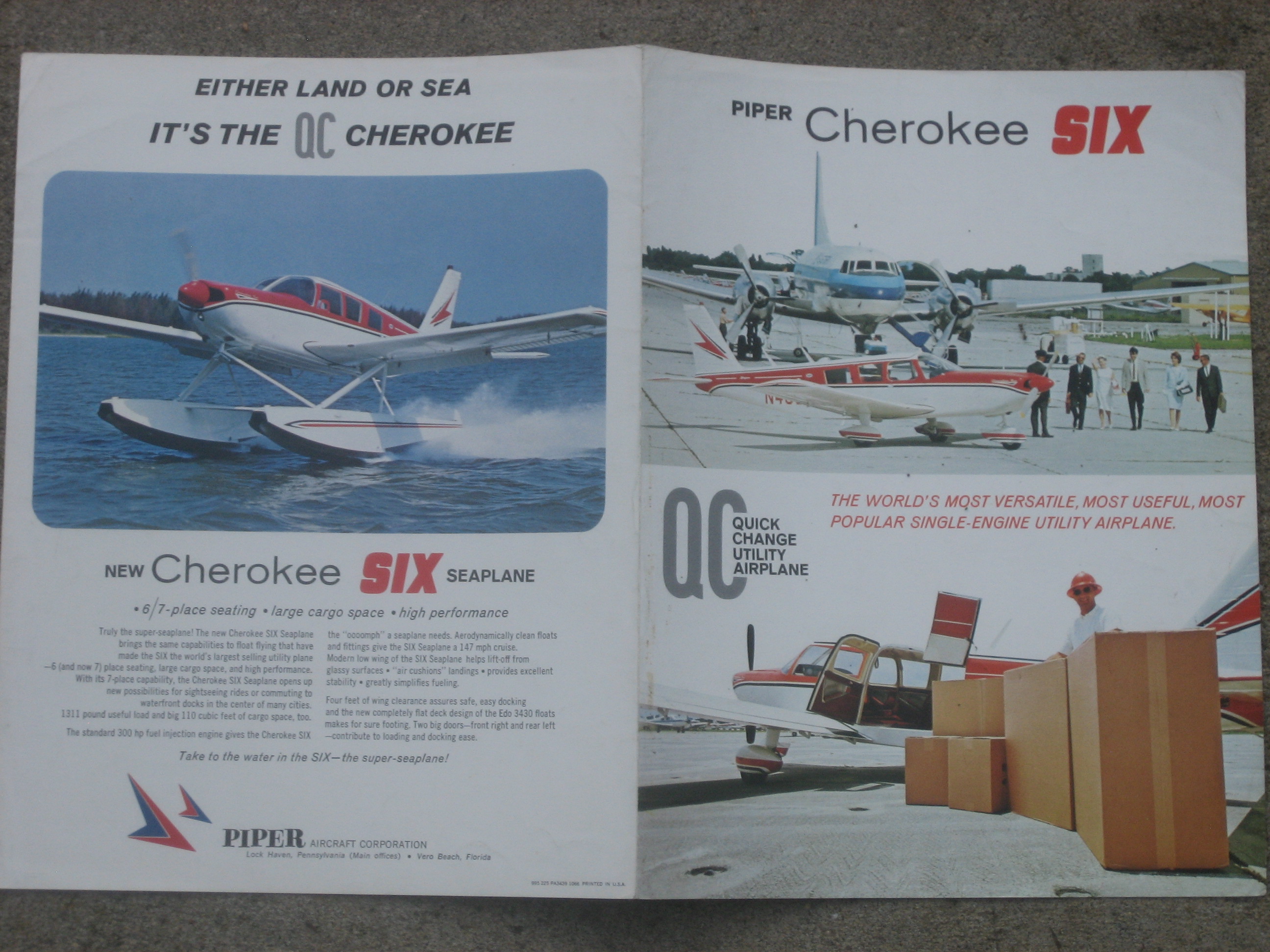 | MCV5. | Piper Cherokee SIX , A Uncommon Piper Cherokee SIX brochure c.1965/1969. Item measures 8 3/8" x 11", two paged two up. rt. cor. creases/light wear. The Cherokee Six's lineage is convoluted. Introduced in 1965 as a longer and wider variation on the PA-28 airframe, the Six was more than four feet longer and seven inches wider than its Cherokee cousins. In the nose that year was a 260-hp Lycoming 0-540. The next model year, a fuel-injected 300-hp engine was an option and soon became the preferred powerplant. IF PLUS SIGN ( + ) SHOWS OVER THE IMAGE, CLICK TO MAGNIFY, used Insdie , | VG $10.00 |