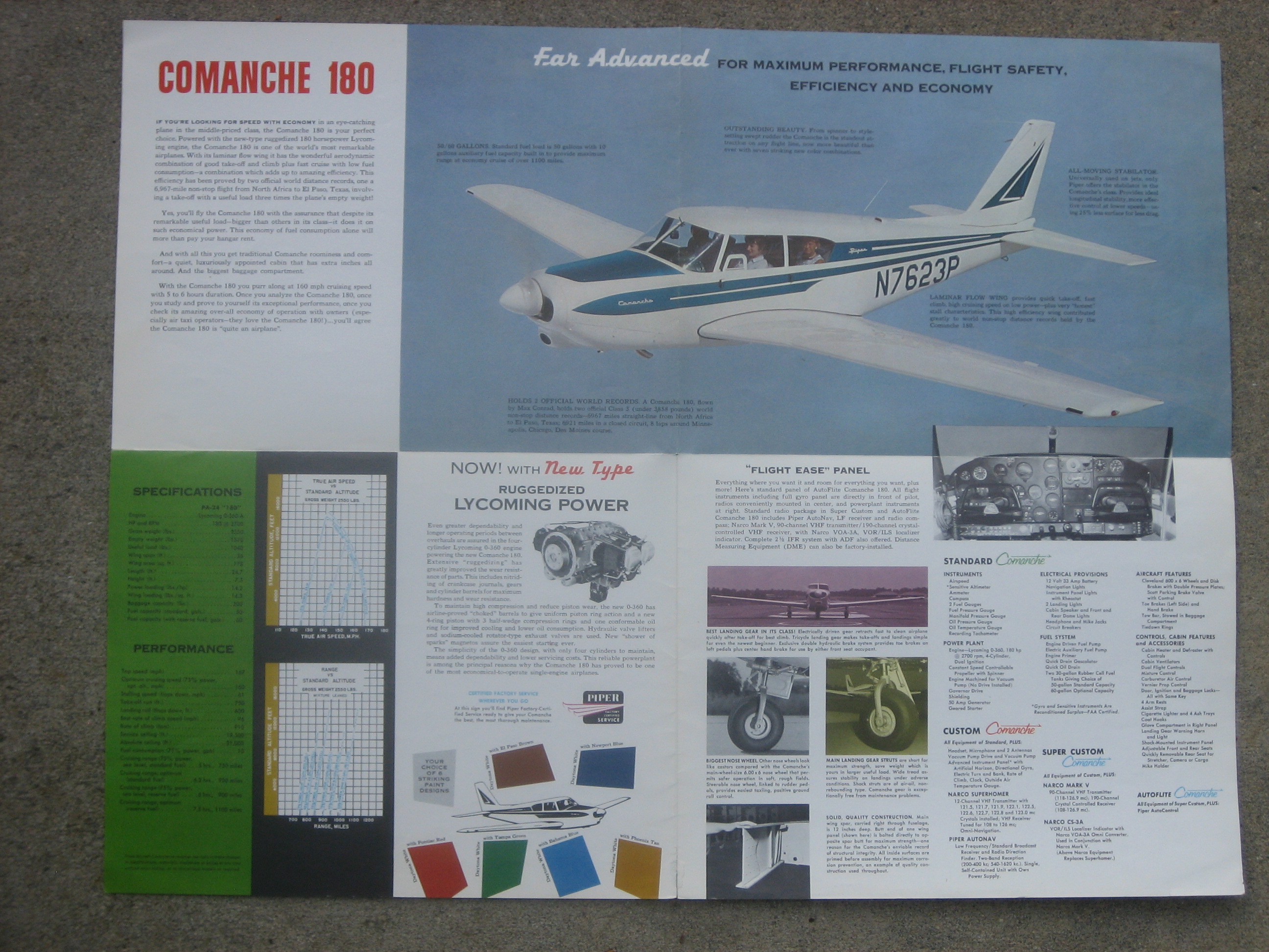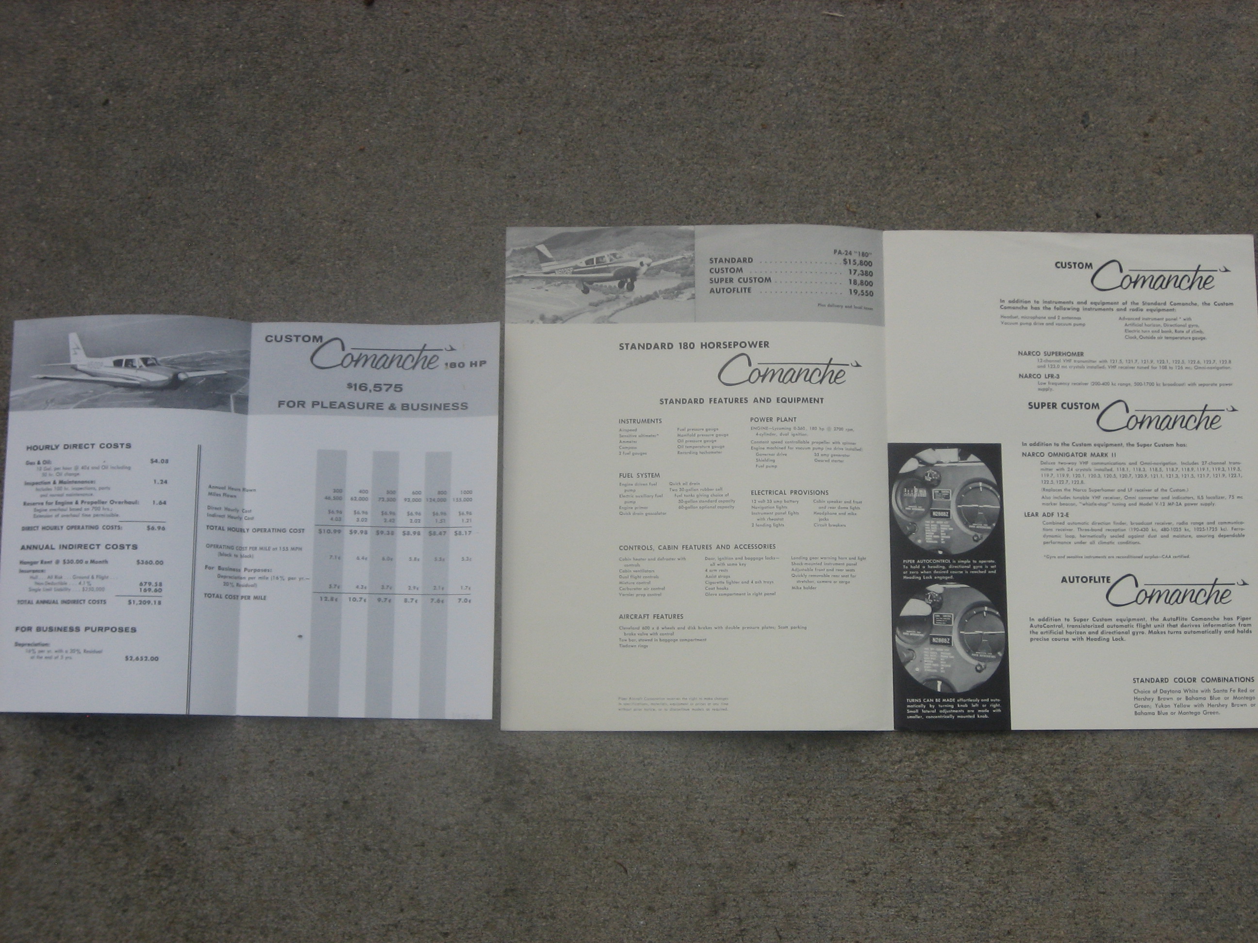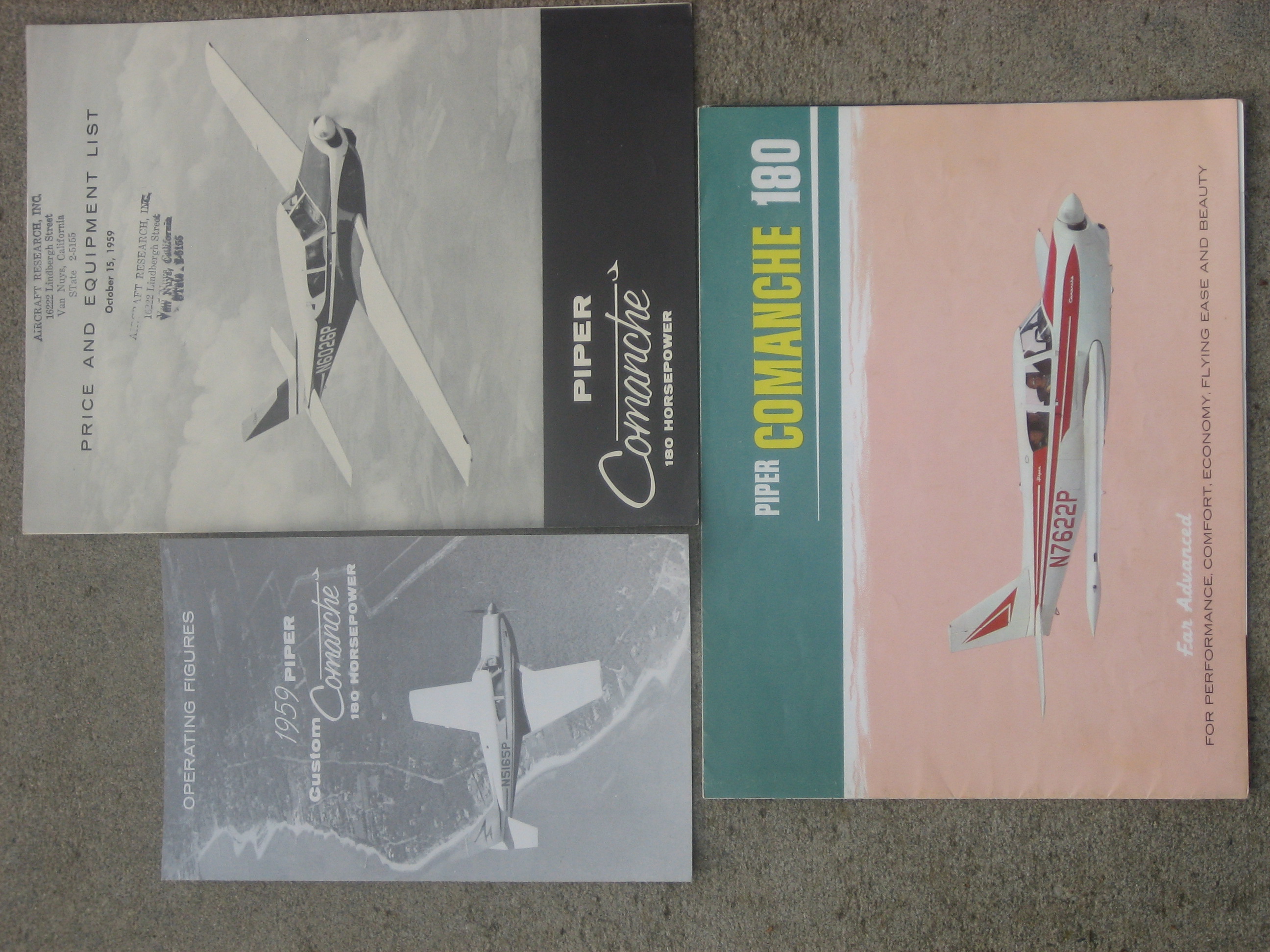 | MCV6. | Piper Comanche 180 , A Cool group of Piper Comanche 180 brochures for 1959. The Operating Figures brochure measures 5 1/2" x 8/1/2", and two paged. The Price & Equipment List brochure measures 8 1/2" x 11", and two paged. The All Color Comanche 180 brochure measures 11" x 8 1/2", and Folds Out to 22" x 17". Two prototypes were built in 1956 with the first being completed by June 20, 1956. The first production aircraft, powered by a 180 hp (134 kW) Lycoming O-360-A1A engine, first flew on October 21, 1957. IF PLUS SIGN ( + ) SHOWS OVER THE IMAGE, CLICK TO MAGNIFY, used View 1 , View 2 | EX $20.00 |