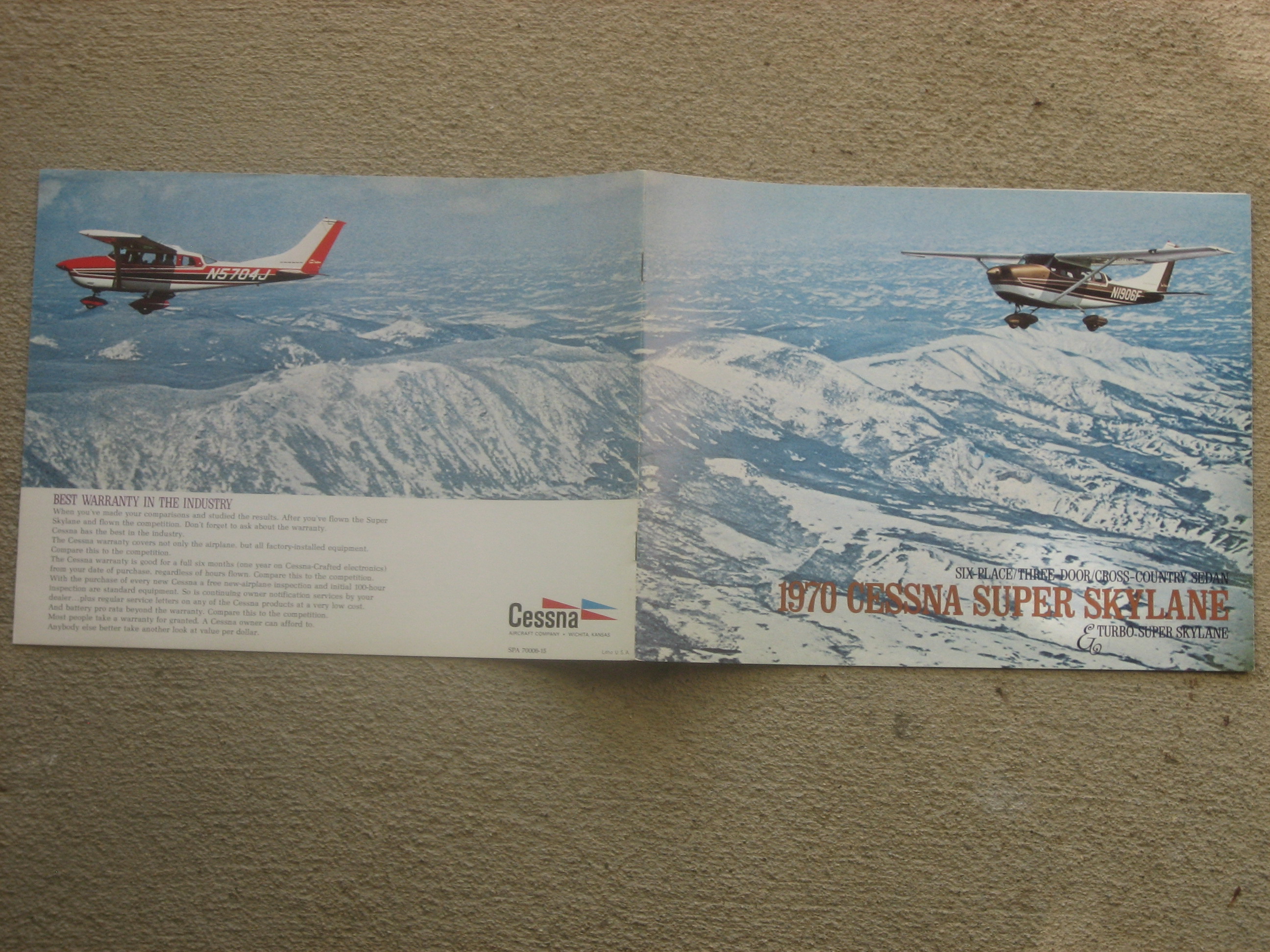 | MCV7. | Cessna Super , A Cool covered Cessna Super Skylane brochure dated 1970. Item measures 10 7/8" x 8 3/8" with ten All Color pages, used View 1 , View 2 , View 3 , View 4 | EX $12.00 |