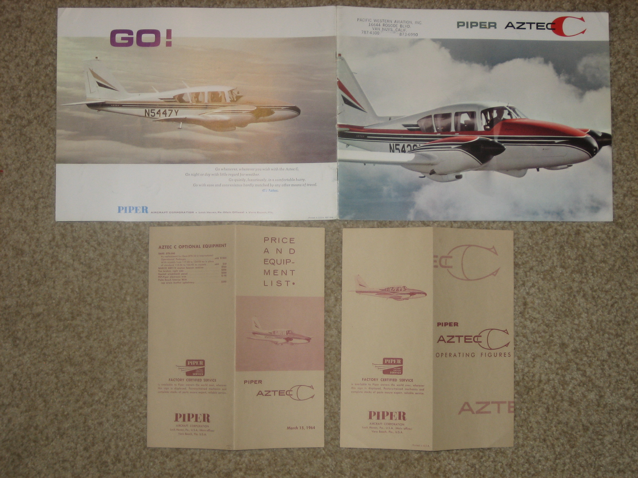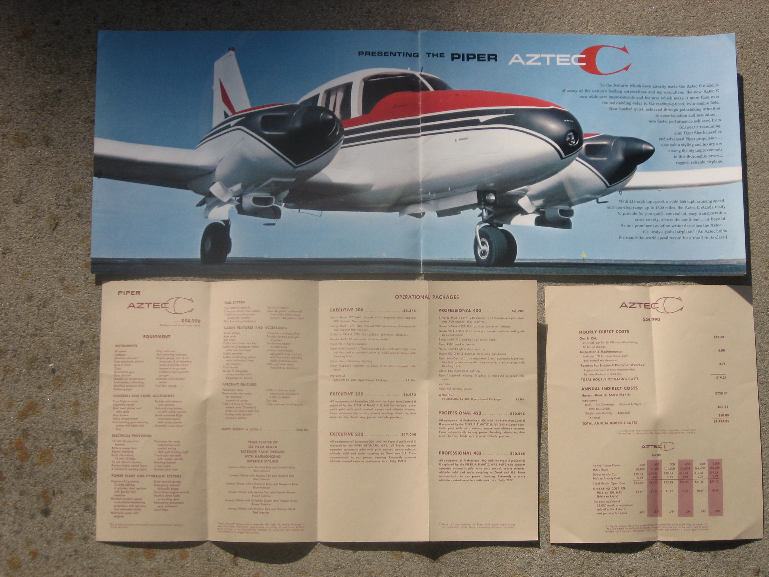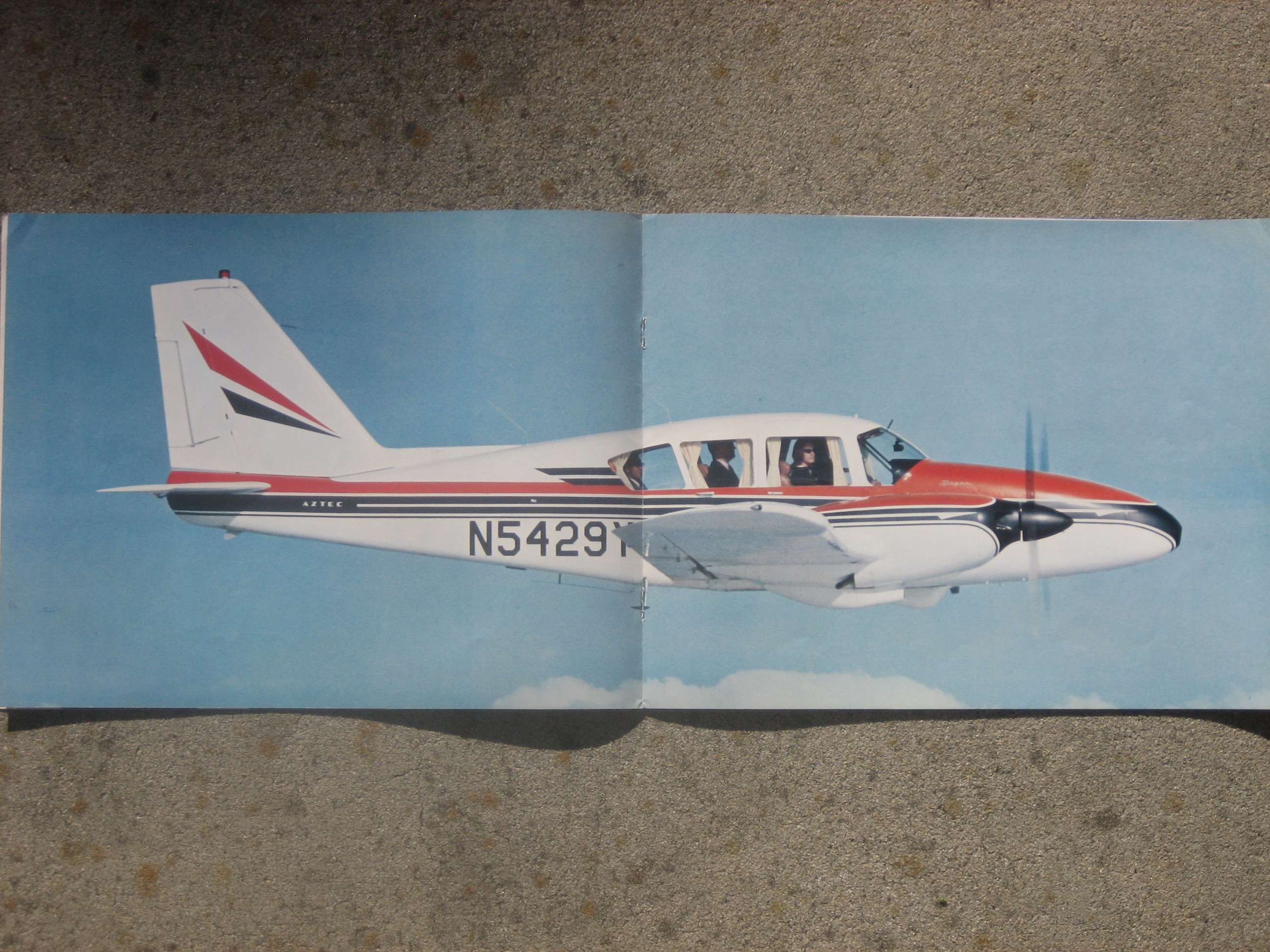 | MCV8. | Piper Aztec C , A Very Scarce and Very Cool Piper AZTEC C brochure with accompanying Operating Figures and Price & Equipment list brochures. The Aztec C brochure measures 11" x 8 1/2", 14 pages and light/light+ front & back cover wear. Has a up. rt. cor. crease, but have to tilt to see the wear. The brochures measure 3 5/8" x 8 1/2" with Ops. Figures is two paneled and the Price & Equip. having four panels.The Aztec C model, which came along in 1964 and would be produced in the greatest numbers. Fuel injection and dual alternators came standard on the C. The C had a top speed of 218 mph (189 knots) and cruised at 208 mph. IF PLUS SIGN ( + ) SHOWS OVER THE IMAGE, CLICK TO MAGNIFY, used View 1 , View 2 , View 3 , View 4 , View 5 | VG+ $18.00 |