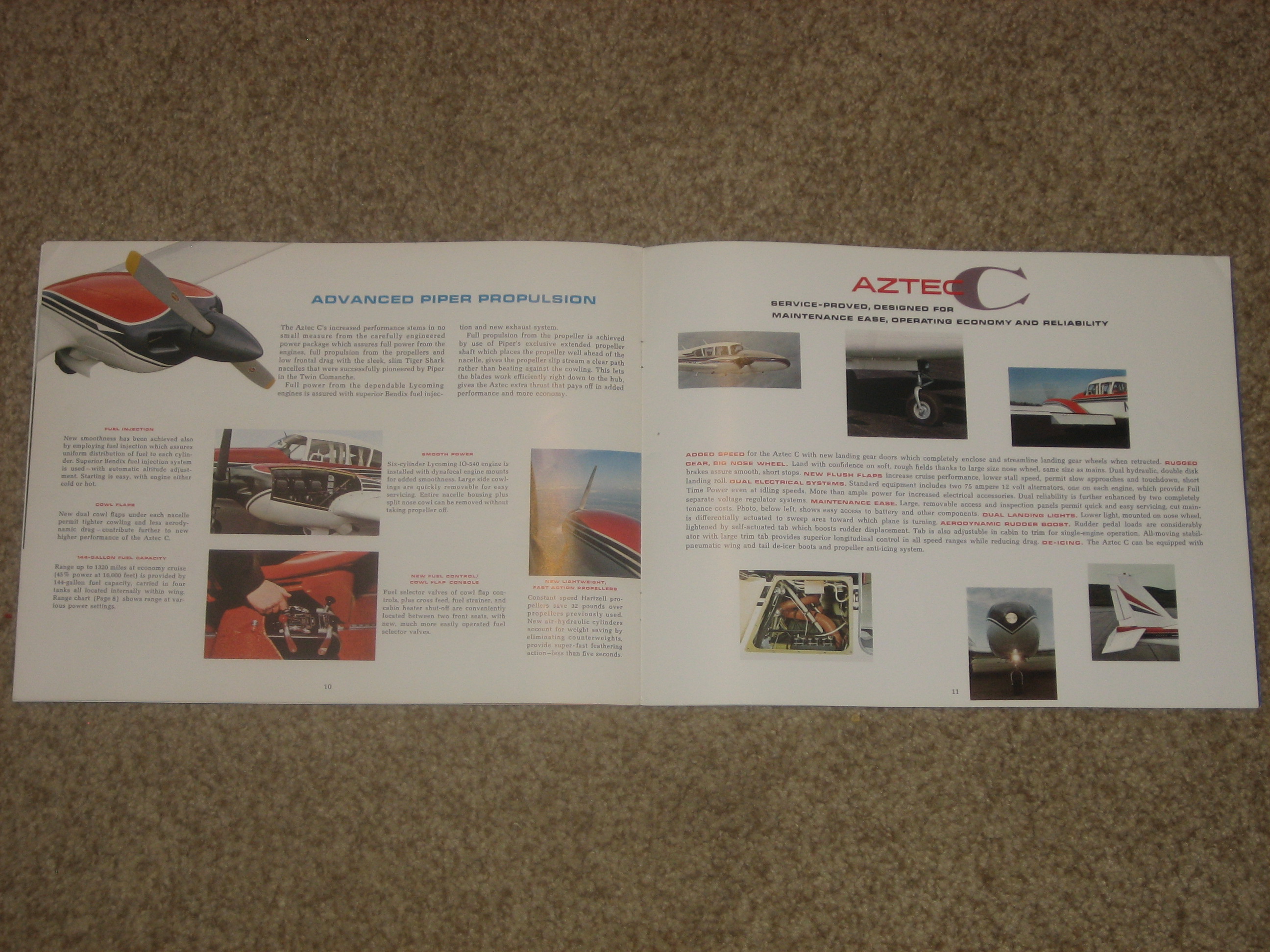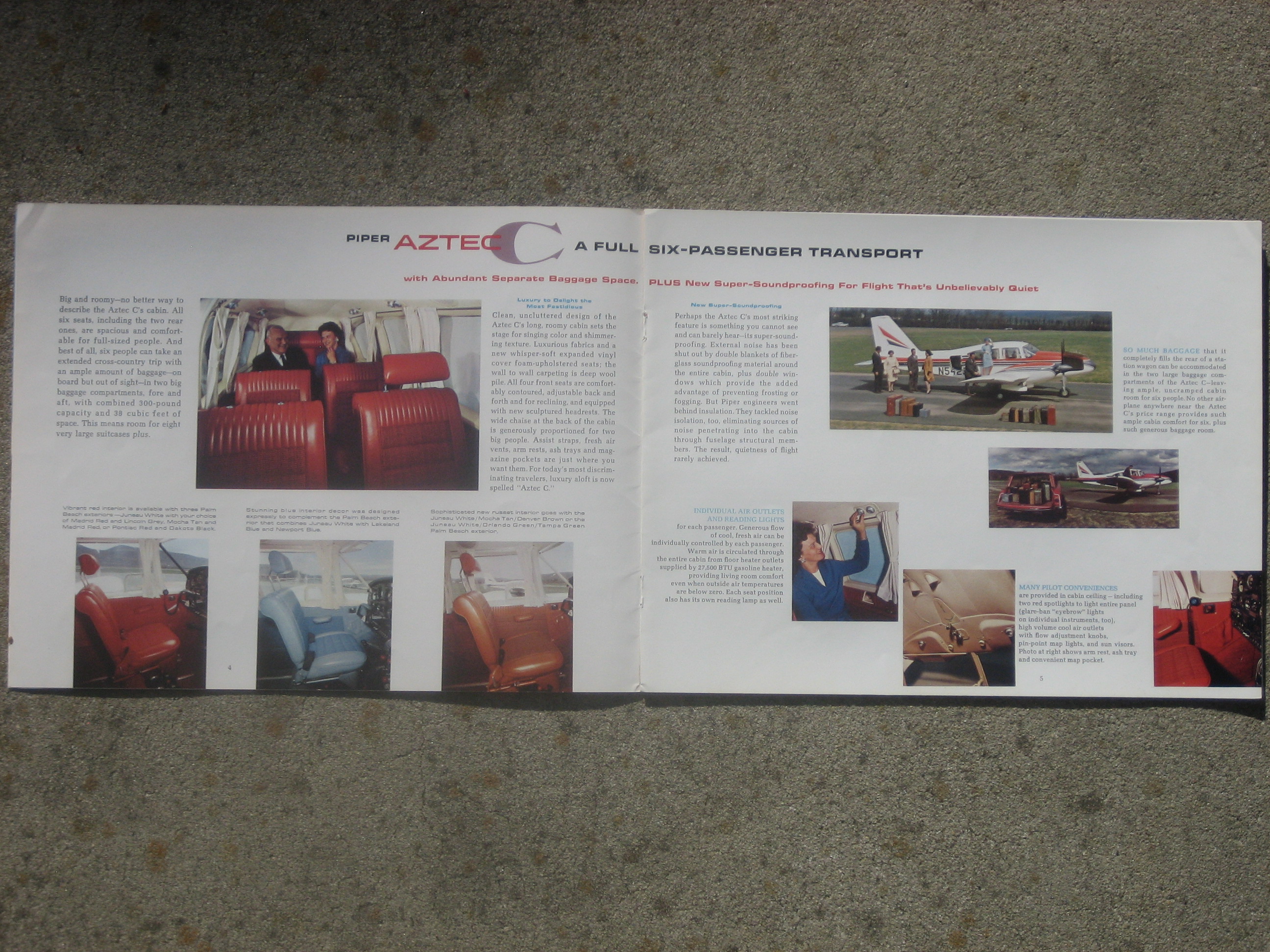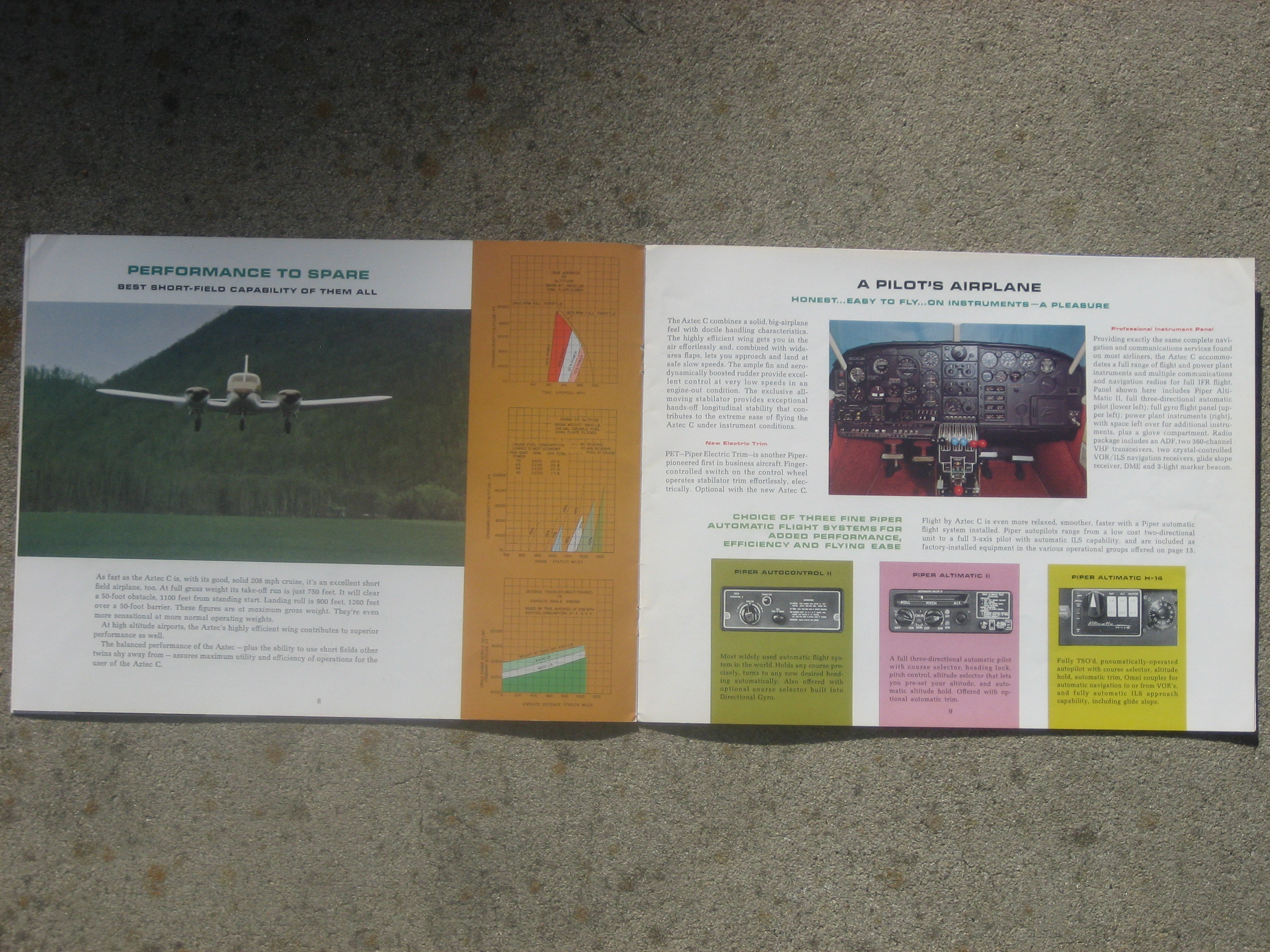| MCV8. | Piper Aztec C , A Very Scarce and Very Cool Piper AZTEC C brochure with accompanying Operating Figures and Price & Equipment list brochures. The Aztec C brochure measures 11" x 8 1/2", 14 pages and light/light+ front & back cover wear. Has a up. rt. cor. crease, but have to tilt to see the wear. The brochures measure 3 5/8" x 8 1/2" with Ops. Figures is two paneled and the Price & Equip. having four panels.The Aztec C model, which came along in 1964 and would be produced in the greatest numbers. Fuel injection and dual alternators came standard on the C. The C had a top speed of 218 mph (189 knots) and cruised at 208 mph. IF PLUS SIGN ( + ) SHOWS OVER THE IMAGE, CLICK TO MAGNIFY, used View 1 , View 2 , View 3 , View 4 , View 5 | VG+ $18.00 |